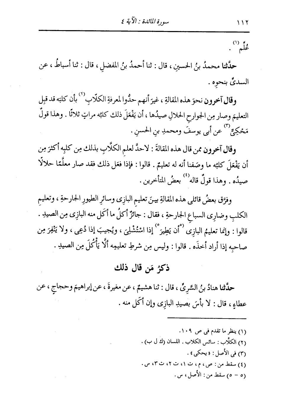 عُلِّمَ» حَدَّثَنَا مُحَمَّدُ بْنُ الْحَسَنِ , قَالَ: ثنا أَحْمَدُ بْنُ الْمُفَضَّلِ , قَالَ: ثنا أَسْبَاطٌ , عَنِ السُّدِّيِّ: بِنَحْوِهِ. وَقَالَ آخَرُونَ نَحْوَ هَذِهِ الْمَقَالَةِ , غَيْرَ أَنَّهُمْ حَدُّوا لِمَعْرِفَةِ الْكِلَابِ بِأَنَّ كَلْبَهُ قَدْ قَبَلَ التَّعْلِيمَ , وَصَارَ مِنَ الْجَوَارِحِ الْحَلَالِ صَيْدُهَا أَنْ يَفْعَلَ ذَلِكَ كَلْبَهُ مَرَّاتٍ ثَلَاثًا وَهَذَا قَوْلٌ مَحْكِيُّ عَنْ أَبِي يُوسُفَ وَمُحَمَّدِ بْنِ الْحَسَنِ. وَقَالَ آخَرُونَ مِمَّنْ قَالَ هَذِهِ الْمَقَالَةَ: لَا حَدَّ لَعِلْمِ الْكِلَابِ بِذَلِكَ مِنْ كَلْبِهِ أَكْثَرُ مِنْ أَنْ يَفْعَلَ كَلْبُهُ مَا وَصَفْنَا أَنَّهُ لَهُ تَعْلِيمٌ؛ قَالُوا: فَإِذَا فَعَلَ ذَلِكَ فَقَدْ صَارَ مُعَلَّمًا حَلَالًا صَيْدُهُ. وَهَذَا قَوْلُ بَعْضِ الْمُتَأَخِّرِينَ. وَفَرَّقَ بَعْضُ قَائِلِي هَذِهِ الْمَقَالَةِ بَيْنَ تَعْلِيمِ الْبَازِي وَسَائِرِ الطُّيُورِ الْجَارِحَةِ , وَتَعْلِيمِ الْكَلْبِ وَضَارِي السِّبَاعِ الْجَارِحَةِ , فَقَالَ: جَائِزٌ أَكْلُ مَا أَكَلَ مِنْهُ الْبَازِي مِنَ الصَّيْدِ. قَالُوا: وَإِنَّمَا تَعْلِيمُ الْبَازِي أَنْ يَطِيرَ إِذَا اسْتُشْلِيَ , وَيُجِيبَ إِذَا دُعِيَ , وَلَا يُنَفَّرَ مِنْ صَاحِبِهِ إِذَا أَرَادَ أَخْذَهُ. قَالُوا: وَلَيْسَ مِنْ شُرُوطِ تَعْلِيمِهِ أَنْ لَا يَأْكُلَ مِنَ الصَّيْدِ