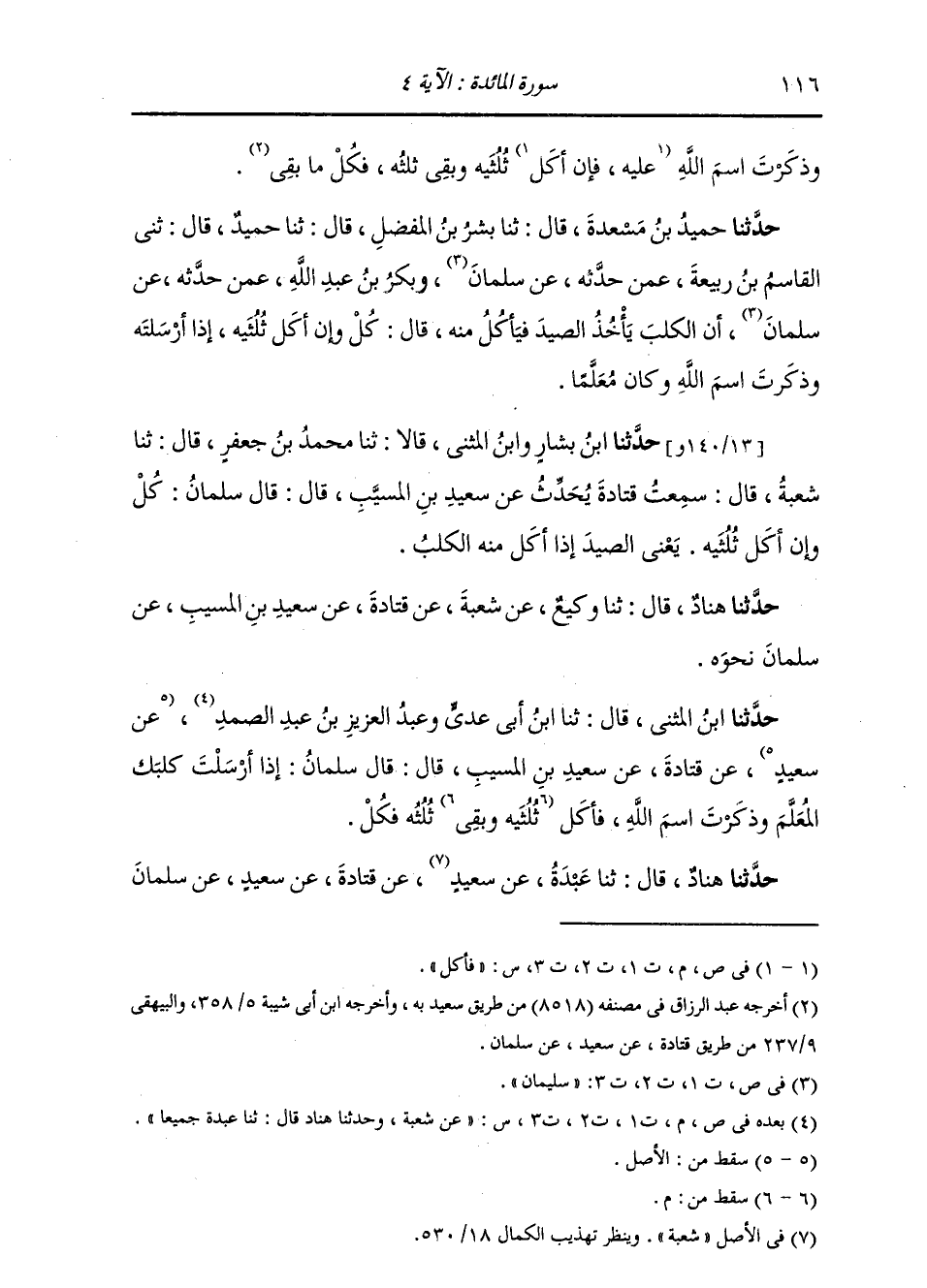 حَدَّثَنَا ابْنُ الْمُثَنَّى قَالَ: ثنا ابْنُ أَبِي عَدِيٍّ وَعَبْدُ الْعَزِيزِ بْنُ عَبْدِ الصَّمَدِ , عَنْ شُعْبَةَ , ح وَحَدَّثَنَا هَنَّادٌ قَالَ: ثنا عَبْدَةُ جَمِيعًا , عَنْ سَعِيدٍ , عَنْ قَتَادَةَ , عَنْ سَعِيدِ بْنِ الْمُسَيِّبِ , قَالَ: قَالَ سَلْمَانُ: «§إِذَا أَرْسَلْتَ كَلْبَكَ الْمُعَلَّمَ وَذَكَرْتَ اسْمَ اللَّهِ فَأَكَلَ ثُلُثَهُ فَكُلْ» حَدَّثَنَا هَنَّادٌ , قَالَ: ثنا عَبْدَةُ , عَنْ سَعِيدٍ , عَنْ قَتَادَةَ , عَنْ سَعِيدٍ , عَنْ سَلْمَانَ , -[117]- نَحْوَهُ