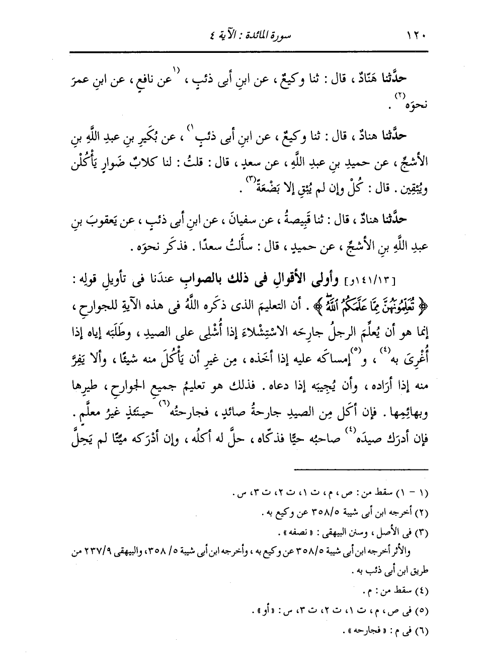 حَدَّثَنَا هَنَّادٌ , قَالَ: ثنا وَكِيعٌ , عَنِ ابْنِ أَبِي ذِئْبٍ , عَنْ بُكَيْرِ بْنِ عَبْدِ اللَّهِ بْنِ الْأَشَجِّ , عَنْ حُمَيْدِ بْنِ عَبْدِ اللَّهِ , عَنْ سَعْدٍ , قَالَ: قُلْتُ: لَنَا كِلَابٌ ضَوَارٍ يَأْكُلْنَ وَيُبْقِينَ؟ قَالَ: «§كُلْ وَإِنْ لَمْ يُبْقِ إِلَّا بَضْعَةً» حَدَثنا هَنَّادٌ , قَالَ: ثنا قَبِيصَةُ , عَنْ سُفْيَانَ , عَنِ ابْنِ أَبِي ذِئْبٍ , عَنْ يَعْقُوبَ بْنِ عَبْدِ اللَّهِ بْنِ الْأَشَجِّ , عَنْ حُمَيْدٍ , قَالَ: سَأَلْتُ سَعْدًا , فَذَكَرَ نَحْوَهُ وَأَوْلَى الْأَقْوَالِ فِي ذَلِكَ بِالصَّوَابِ عِنْدَنَا فِي تَأْوِيلِ قَوْلِهِ: {تُعَلِّمُونَهُنَّ مِمَّا عَلَّمَكُمُ اللَّهُ} [المائدة: 4] أَنَّ التَّعْلِيمِ الَّذِي ذَكَرَهُ اللَّهُ فِي هَذِهِ الْآيَةِ لِلْجَوَارِحِ , إِنَّمَا هُوَ أَنْ يُعَلِّمَ الرَّجُلُ جَارِحَهُ الِاسْتِشْلَاءَ إِذَا أُشْلِيَ عَلَى الصَّيْدِ , وَطَلَبَهُ إِيَّاهُ إِذَا أُغْرِيَ , أَوْ إِمْسَاكَهُ عَلَيْهِ إِذَا أَخَذَ مِنْ غَيْرِ أَنْ يَأْكُلَ مِنْهُ شَيْئًا , وَأَلَّا يَفِرَّ مِنْهُ إِذَا أَرَادَهُ , وَأَنْ يُجِيبَهُ إِذَا دَعَاهُ , فَذَلِكَ هُوَ تَعْلِيمُ جَمِيعِ الْجَوَارِحِ طَيْرِهَا وَبَهَائِمِهَا. وَإِنْ أَكَلَ مِنَ الصَّيْدِ جَارِحَةُ صَائِدٍ , فَجَارِحُهُ حِينَئِذٍ غَيْرُ مُعَلَّمٍ. فَإِنْ أَدْرَكَ صَاحِبُهُ حَيًّا فَذَكَّاهُ حَلَّ لَهُ أَكْلُهُ , وَإِنْ أَدْرَكَهُ مَيِّتًا لَمْ يَحِلَّ -[121]- لَهُ , لِأَنَّهُ مِمَّا أَكَلَهُ السَّبُعُ الَّذِي حَرَّمَهُ اللَّهُ تَعَالَى بِقَوْلِهِ: {وَمَا أَكَلَ السَّبُعُ} [المائدة: 3] وَلَمْ يُدْرَكْ ذَكَاتُهُ. وَإِنَّمَا قُلْنَا ذَلِكَ أَوْلَى الْأَقْوَالِ فِي ذَلِكَ بِالصَّوَابِ لِتَظَاهُرِ الْأَخْبَارِ عَنْ رَسُولِ اللَّهِ صَلَّى اللهُ عَلَيْهِ وَسَلَّمَ بِمَا