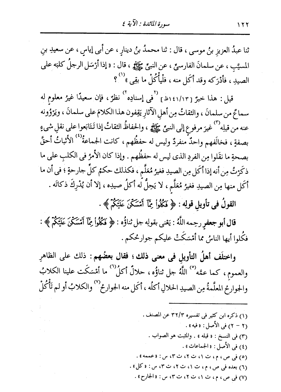 §الْقَوْلُ فِي تَأْوِيلِ قَوْلِهِ تَعَالَى: {فَكُلُوا مِمَّا أَمْسَكْنَ عَلَيْكُمْ} [المائدة: 4] يَعْنِي بِقَوْلِهِ: {فَكُلُوا مِمَّا أَمْسَكْنَ عَلَيْكُمْ} [المائدة: 4] فَكُلُوا أَيُّهَا النَّاسُ مِمَّا أَمْسَكَتْ عَلَيْكُمْ جَوَارِحُكُمْ. وَاخْتَلَفَ أَهْلُ التَّأْوِيلِ فِي مَعْنَى ذَلِكَ , فَقَالَ بَعْضُهُمْ: ذَلِكَ عَلَى الظَّاهِرِ وَالْعُمُومِ كَمَا عَمَّمَهُ اللَّهُ حَلَالٌ أَكْلُ كُلِّ مَا أَمْسَكَتْ عَلَيْنَا الْكِلَابُ وَالْجَوَارِحُ الْمُعَلَّمَةُ مِنَ الصَّيْدِ الْحَلَالِ أَكْلُهُ , أَكَلَ مِنْهُ الْجَارِحُ وَالْكِلَابُ أَوْ لَمْ يَأْكُلْ