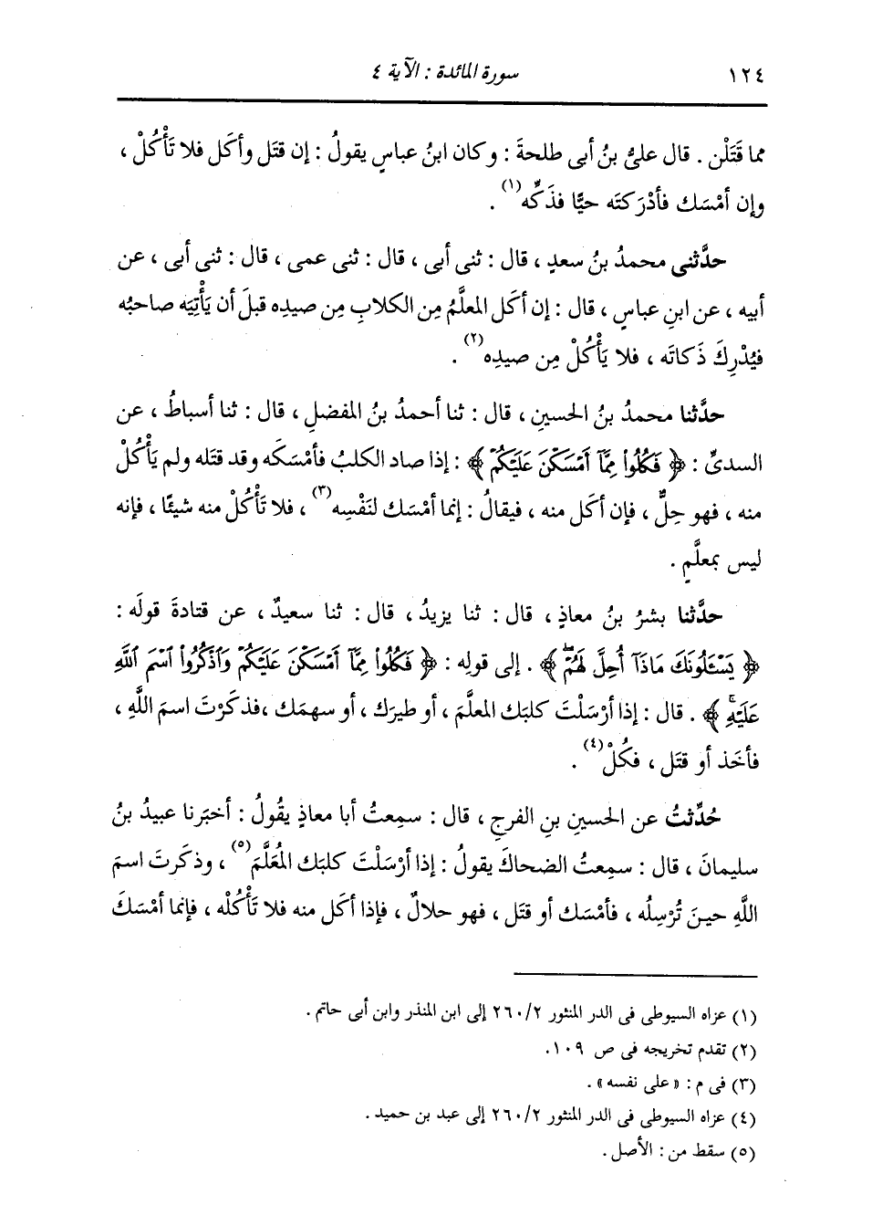 حَدَّثَنَا مُحَمَّدُ بْنُ الْحُسَيْنِ , قَالَ: ثنا أَحْمَدُ بْنُ الْمُفَضَّلِ , قَالَ: ثنا أَسْبَاطٌ , عَنِ السُّدِّيِّ: {§فَكُلُوا مِمَّا أَمْسَكْنَ عَلَيْكُمْ} [المائدة: 4] إِذَا صَادَ الْكَلْبُ فَأَمْسَكَهُ وَقَدْ قَتَلَهُ وَلَمْ يَأْكُلْ مِنْهُ , فَهُوَ حِلٌّ , فَإِنْ أَكَلَ مِنْهُ , فَيُقَالَ: إِنَّمَا أَمْسَكَ عَلَى نَفْسِهِ , فَلَا تَأْكُلْ مِنْهُ شَيْئًا , إِنَّهُ لَيْسَ بِمُعَلَّمٍ "