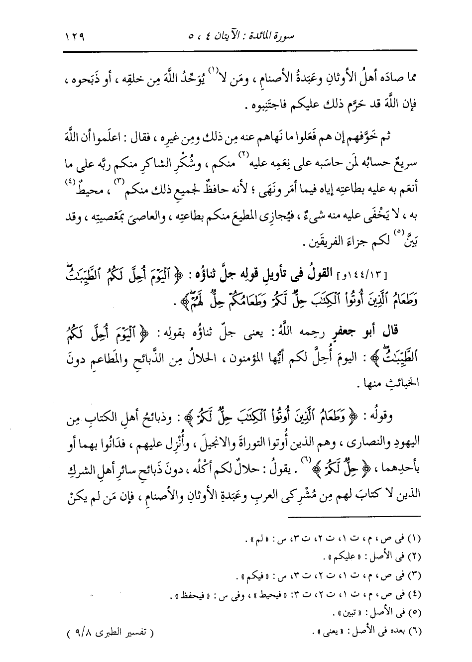 §الْقَوْلُ فِي تَأْوِيلِ قَوْلِهِ تَعَالَى: {الْيَوْمَ أُحِلَّ لَكُمُ الطَّيِّبَاتُ وَطَعَامُ الَّذِينَ أُوتُوا الْكِتَابَ حِلٌّ لَكُمْ وَطَعَامُكُمْ حِلٌّ لَهُمْ وَالْمُحْصَنَاتُ مِنَ الْمُؤْمِنَاتِ وَالْمُحْصَنَاتُ مِنَ الَّذِينَ أُوتُوا الْكِتَابَ مِنْ قَبْلِكُمْ إِذَا آتَيْتُمُوهُنَّ أُجُورَهُنَّ مُحْصِنِينَ غَيْرَ مُسَافِحِينَ وَلَا مُتَّخِذِي أَخْدَانَ وَمَنْ يَكْفُرْ بِالْإِيمَانِ فَقَدْ حَبِطَ عَمَلُهُ وَهُوَ فِي الْآخِرَةِ مِنَ الْخَاسِرِينَ} [المائدة: 5] يَعْنِي جَلَّ ثَنَاؤُهُ بِقَوْلِهِ: {الْيَوْمَ أُحِلَّ لَكُمُ الطَّيِّبَاتُ} [المائدة: 5] الْيَوْمَ أَحِلَّ لَكُمْ أَيُّهَا الْمُؤْمِنُونَ الْحَلَالُ مِنَ الذَّبَائِحِ وَالْمَطَاعِمِ , دُونَ الْخَبَائِثِ مِنْهَا. قَوْلُهُ: {وَطَعَامُ الَّذِينَ أُوتُوا الْكِتَابَ حِلٌّ لَكُمْ} [المائدة: 5] وَذَبَائِحُ أَهْلِ الْكِتَابِ مِنَ الْيَهُودِ وَالنَّصَارَى , وَهُمُ الَّذِينَ أُوتُوا التَّوْرَاةَ وَالْإِنْجِيلَ , وَأُنْزِلَ عَلَيْهِمْ , فَدَانُوا بِهِمَا أَوْ بِأَحَدِهِمَا {حِلٌّ لَكُمْ} [المائدة: 5] يَقُولُ: " حَلَالٌ لَكُمْ أَكْلُهُ دُونَ ذَبَائِحِ سَائِرِ أَهْلِ الشِّرْكِ الَّذِينَ لَا كِتَابَ لَهُمْ مِنْ مُشْرِكِي الْعَرَبِ وَعَبَدَةِ الْأَوْثَانِ وَالْأَصْنَامِ , فَإِنَّ مَنْ لَمْ يَكُنْ