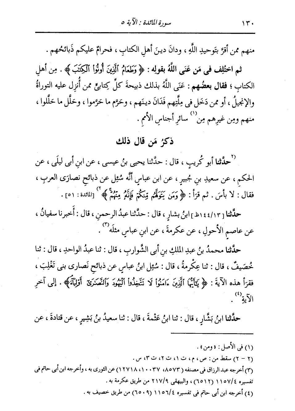 ذِكْرُ مَنْ قَالَ ذَلِكَ: حَدَّثَنَا مُحَمَّدُ بْنُ عَبْدِ الْمَلِكِ بْنِ أَبِي الشَّوَارِبِ , قَالَ: ثنا عَبْدُ الْوَاحِدِ , قَالَ: ثنا خُصَيْفٌ , قَالَ: ثنا عِكْرِمَةُ , قَالَ: سُئِلَ ابْنُ عَبَّاسٍ عَنْ ذَبَائِحِ نَصَارَى بَنِي تَغْلِبَ , فَقَرَأَ هَذِهِ الْآيَةَ: {§يَا أَيُّهَا الَّذِينَ آمَنُوا لَا تَتَّخِذُوا الْيَهُودَ} [المائدة: 51] إِلَى قَوْلِهِ: {وَمَنْ يَتَوَلَّهُمْ مِنْكُمْ فَإِنَّهُ مِنْهُمْ} [المائدة: 51] الْآيَةُ " حَدَّثَنَا ابْنُ بَشَّارٍ , قَالَ: ثنا عَبْدُ الرَّحْمَنِ , قَالَ: ثنا سُفْيَانُ , عَنْ عَاصِمٍ الْأَحْوَلِ , عَنْ عِكْرِمَةَ , عَنِ ابْنِ عَبَّاسٍ , مِثْلَهُ