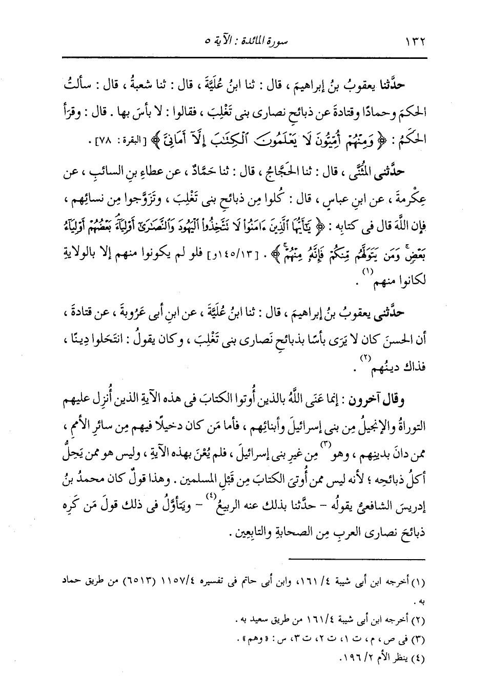 حَدَّثَنَا يَعْقُوبُ بْنُ إِبْرَاهِيمَ , قَالَ: ثنا ابْنُ عُلَيَّةَ , قَالَ: ثنا شُعْبَةُ , قَالَ: سَأَلْتُ الْحَكَمَ وَحَمَّادًا وَقَتَادَةَ §عَنْ ذَبَائِحِ نَصَارَى بَنِي تَغْلِبَ , فَقَالُوا: " لَا بَأْسَ بِهَا. قَالَ: وَقَرَأَ الْحَكَمُ: {وَمِنْهُمْ أُمِّيُّونَ لَا يَعْلَمُونَ الْكِتَابَ إِلَّا أَمَانِيَّ} [البقرة: 78] "