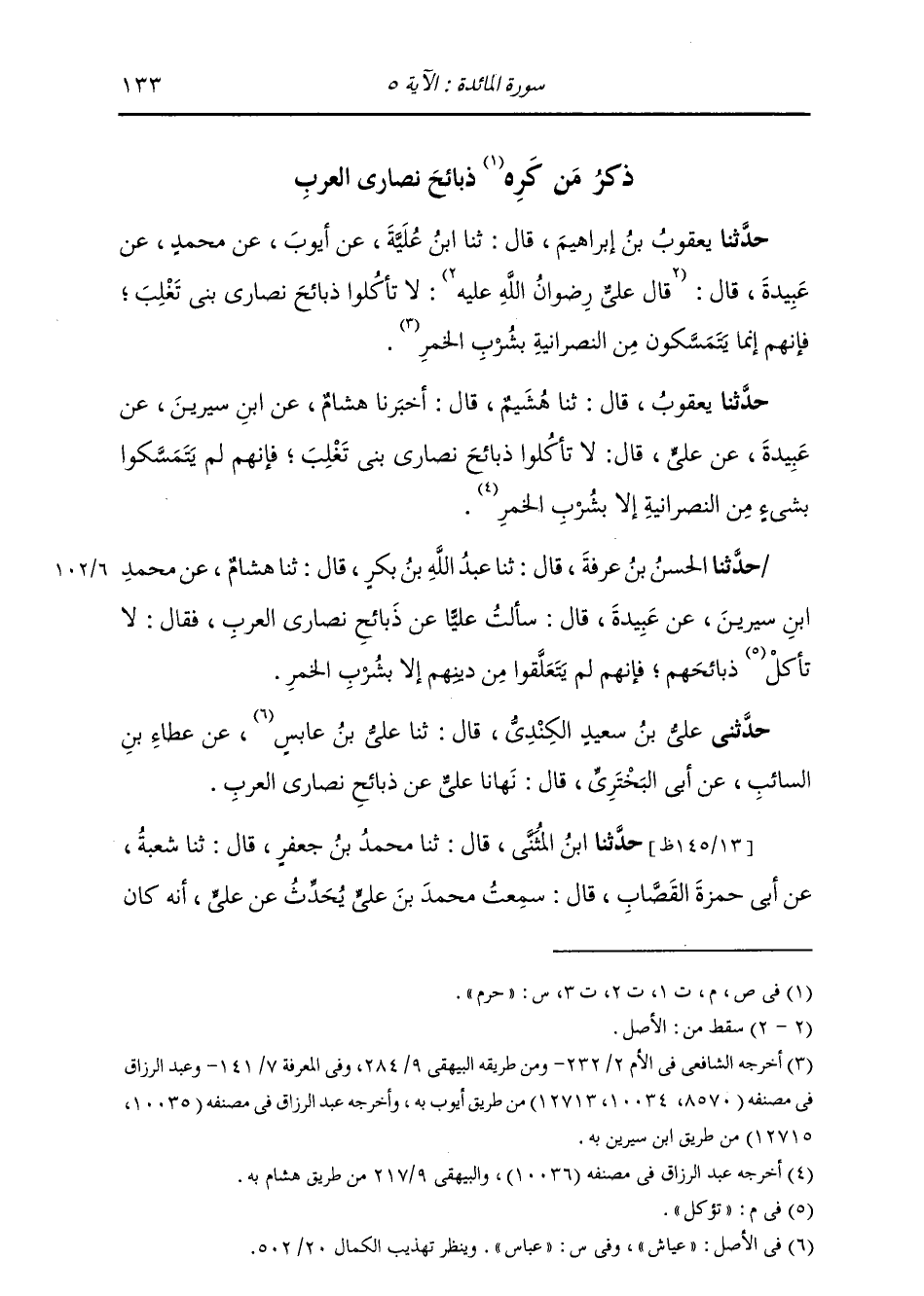 حَدَّثَنَا يَعْقُوبُ , قَالَ: ثنا هُشَيْمٌ , قَالَ: أَخْبَرَنَا هِشَامٌ , عَنِ ابْنِ سِيرِينَ , عَنْ عَبِيدَةَ , عَنْ عَلِيٍّ , قَالَ: «§لَا تَأْكُلُوا ذَبَائِحَ نَصَارَى بَنِي تَغْلِبَ , فَإِنَّهُمْ لَمْ يَتَمَسَّكُوا بِشَيْءٍ مِنَ النَّصْرَانِيَّةِ إِلَّا بِشُرْبِ الْخَمْرِ»
