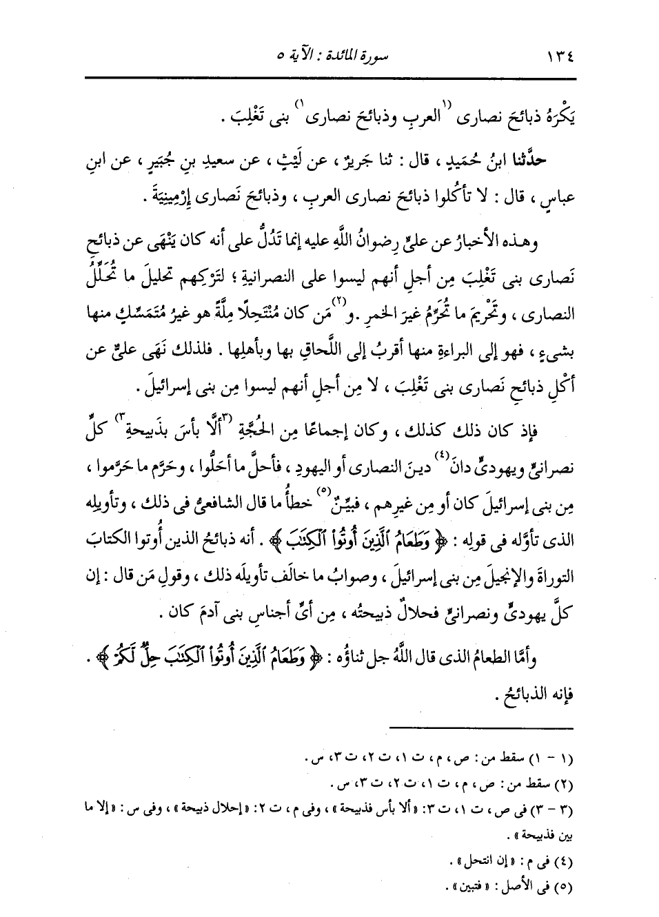 حَدَّثَنَا ابْنُ حُمَيْدٍ , قَالَ: ثنا جَرِيرٌ , عَنْ لَيْثٍ , عَنْ سَعِيدِ بْنِ جُبَيْرٍ , عَنِ ابْنِ عَبَّاسٍ , قَالَ: «§لَا تَأْكُلُوا ذَبَائِحَ نَصَارَى الْعَرَبِ وَذَبَائِحَ نَصَارَى أَرْمِينِيَةَ» وَهَذِهِ الْأَخْبَارُ عَنْ عَلِيٍّ رِضْوَانُ اللَّهِ عَلَيْهِ , إِنَّمَا تَدُلُّ عَلَى أَنَّهُ كَانَ يَنْهَى , عَنْ ذَبَائِحِ نَصَارَى بَنِي تَغْلِبَ مِنْ أَجْلِ أَنَّهُمْ لَيْسُوا عَلَى النَّصْرَانِيَّةِ , لِتَرْكِهِمْ تَحْلِيلَ مَا تُحَلِّلُ النَّصَارَى وَتَحْرِيمَ مَا تُحَرِّمُ غَيْرَ الْخَمْرِ. وَمَنْ كَانَ مُنْتَحِلًا مِلَّةً هُوَ غَيْرُ مُتَمَسِّكٍ مِنْهَا بِشَيْءٍ , فَهُوَ إِلَى الْبَرَاءَةِ مِنْهَا أَقْرَبُ إِلَى اللَّحَاقِ بِهَا وَبِأَهْلِهَا , فَلِذَلِكَ نَهَى عَلِيٌّ عَنْ أَكْلِ ذَبَائِحِ نَصَارَى بَنِي تَغْلِبَ , لَا مِنْ أَجْلِ أَنَّهُمْ لَيْسُوا مِنْ بَنِي إِسْرَائِيلَ. فَإِذَا كَانَ ذَلِكَ كَذَلِكَ , وَكَانَ إِجْمَاعًا مِنَ الْحُجَّةِ إِحْلَالُ ذَبِيحَةِ كُلِّ نَصْرَانِيٍّ وَيَهُودِيٍّ , إِنِ انْتَحَلَ دِينَ النَّصَارَى أَوِ الْيَهُودِ , فَأَحَلَّ مَا أَحَلُّوا , وَحَرَّمَ مَا حَرَّمُوا مِنْ بَنِي إِسْرَائِيلَ كَانَ أَوْ مِنْ غَيْرِهِمْ , فَبَيِّنٌ خَطَأُ مَا قَالَ الشَّافِعِيُّ فِي ذَلِكَ وَتَأْوِيلُهُ الَّذِي تَأَوَّلَهُ فِي قَوْلِهِ: {وَطَعَامُ الَّذِينَ أُوتُوا الْكِتَابَ حِلٌّ لَكُمْ} [المائدة: 5] أَنَّهُ ذَبَائِحُ الَّذِينَ أُوتُوا الْكِتَابَ التَّوْرَاةَ وَالْإِنْجِيلَ مِنْ بَنِي إِسْرَائِيلَ , وَصَوَابُ مَا خَالَفَ تَأْوِيلَهُ ذَلِكَ , وَقَوْلُ مَنْ قَالَ: إِنَّ كُلَّ يَهُودِيٍّ وَنَصْرَانِيٍّ فَحَلَالٌ ذَبِيحَتُهُ مِنْ أَيِّ أَجْنَاسِ بَنِي آدَمَ كَانَ. وَأَمَّا الطَّعَامُ الَّذِي قَالَ اللَّهُ: {وَطَعَامُ الَّذِينَ أُوتُوا الْكِتَابَ} [المائدة: 5] فَإِنَّهُ الذَّبَائِحُ. -[135]- وَبِمِثْلِ مَا قُلْنَا فِي ذَلِكَ قَالَ أَهْلُ التَّأْوِيلِ