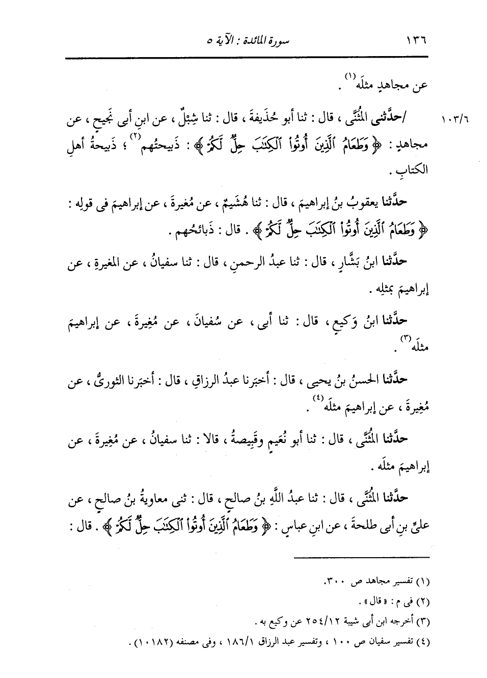 حَدَّثَنَا يَعْقُوبُ بْنُ إِبْرَاهِيمَ , قَالَ: ثنا هُشَيْمٌ , عَنْ مُغِيرَةَ , عَنْ إِبْرَاهِيمَ , فِي قَوْلِهِ: {§وَطَعَامُ الَّذِينَ أُوتُوا الْكِتَابَ حِلٌّ لَكُمْ} [المائدة: 5] قَالَ: «ذَبَائِحُهُمْ» حَدَّثَنَا ابْنُ بَشَّارٍ , قَالَ: ثنا عَبْدُ الرَّحْمَنِ , قَالَ: ثنا سُفْيَانُ عَنِ الْمُغِيرَةِ , عَنْ إِبْرَاهِيمَ , بِمِثْلِهِ حَدَّثَنَا ابْنُ وَكِيعٍ , قَالَ: ثنا أَبِي , عَنْ سُفْيَانَ , عَنْ مُغِيرَةَ , عَنْ إِبْرَاهِيمَ , مِثْلَهُ حَدَّثَنَا الْحَسَنُ بْنُ يَحْيَى , قَالَ: أَخْبَرَنَا عَبْدُ الرَّزَّاقِ , قَالَ: أَخْبَرَنَا الثَّوْرِيُّ , عَنْ مُغِيرَةَ , عَنْ إِبْرَاهِيمَ , مِثْلَهُ حَدَّثَنَا الْمُثَنَّى قَالَ: ثنا أَبُو نُعَيْمٍ وَقَبِيصَةُ , قَالَا: ثنا سُفْيَانُ , عَنْ مُغِيرَةَ , عَنْ إِبْرَاهِيمَ مِثْلَهُ