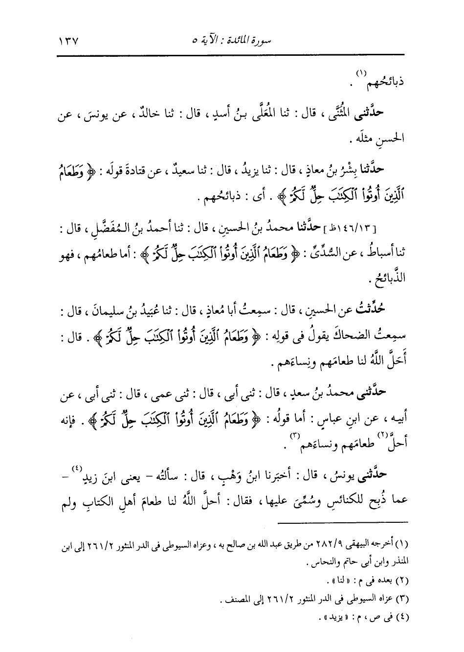 حَدَّثَنَا بِشْرٌ , قَالَ: ثنا يَزِيدُ , قَالَ: ثنا سَعِيدٌ , عَنْ قَتَادَةَ , قَوْلُهُ: {§وَطَعَامُ الَّذِينَ أُوتُوا الْكِتَابَ حِلٌّ لَكُمْ} [المائدة: 5] أَيْ ذَبَائِحُهُمْ "