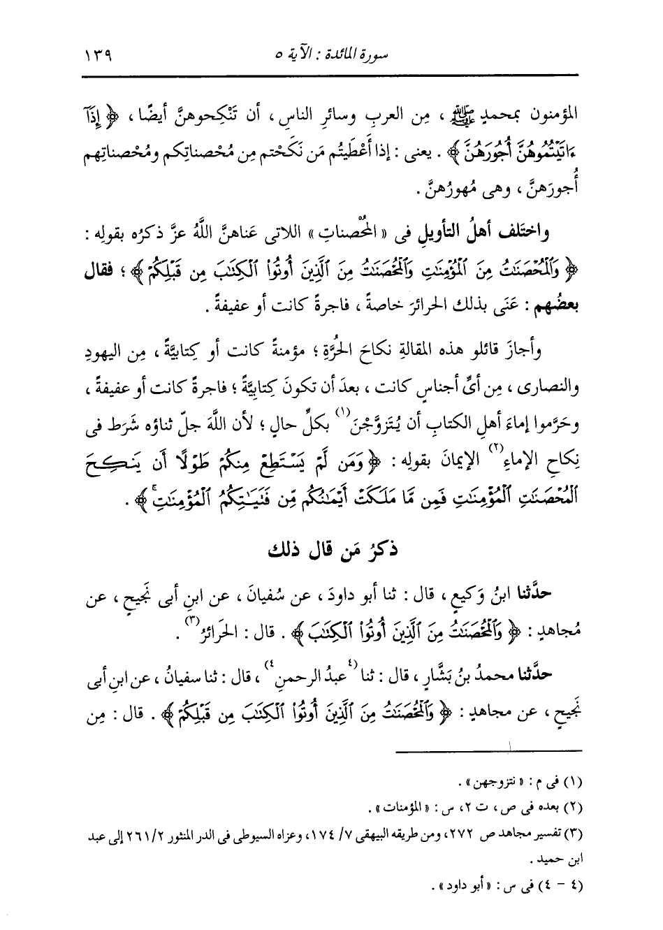 الْمُؤْمِنُونَ بِمُحَمَّدٍ صَلَّى اللهُ عَلَيْهِ وَسَلَّمَ مِنَ الْعَرَبِ وَسَائِرِ النَّاسِ , أَنْ تَنْكِحُوهُنَّ أَيْضًا. {إِذَا آتَيْتُمُوهُنَّ أُجُورَهُنَّ} [المائدة: 5] يَعْنِي: إِذَا أَعْطَيْتُمْ مَنْ نَكَحْتُمْ مِنْ مُحْصَنَاتِكُمْ وَمُحْصَنَاتِهِمْ أُجُورَهُنَّ، وَهِيَ مُهُورُهُنَّ. وَاخْتَلَفَ أَهْلُ التَّأْوِيلِ فِي الْمُحْصَنَاتِ اللَّاتِي عَنَاهُنَّ اللَّهُ عَزَّ ذِكْرُهُ بِقَوْلِهِ: {وَالْمُحْصَنَاتُ مِنَ الْمُؤْمِنَاتِ وَالْمُحْصَنَاتُ مِنَ الَّذِينَ أُوتُوا الْكِتَابَ مِنْ قَبْلِكُمْ} [المائدة: 5] فَقَالَ بَعْضُهُمْ: عَنَى بِذَلِكَ الْحَرَائِرَ خَاصَّةً , فَاجِرَةً كَانَتْ أَوْ عَفِيفَةً , وَأَجَازَ قَائِلُو هَذِهِ الْمَقَالَةِ نِكَاحَ الْحُرَّةِ مُؤْمِنَةً كَانَتْ أَوْ كِتَابِيَةً مِنَ الْيَهُودِ وَالنَّصَارَى مِنْ أَيِّ أَجْنَاسٍ كَانَتْ , بَعْدَ أَنْ تَكُونَ كِتَابِيَّةً فَاجِرَةً كَانَتْ أَوْ عَفِيفَةً , وَحَرَّمُوا إِمَاءَ أَهْلِ الْكِتَابِ أَنْ نَتَزَوَّجَهُنَّ بِكُلِّ حَالٍ؛ لِأَنَّ اللَّهَ جَلَّ ثَنَاؤُهُ شَرَطَ مِنْ نِكَاحِ الْإِمَاءِ الْإِيمَانَ بِقَوْلِهِ: {وَمَنْ لَمْ يَسْتَطِعْ مِنْكُمْ طَوْلًا أَنْ يَنْكِحَ الْمُحْصَنَاتِ الْمُؤْمِنَاتِ فَمِنْ مَا مَلَكَتْ أَيْمَانُكُمْ مِنْ فَتَيَاتِكُمُ الْمُؤْمِنَاتِ} [النساء: 25]