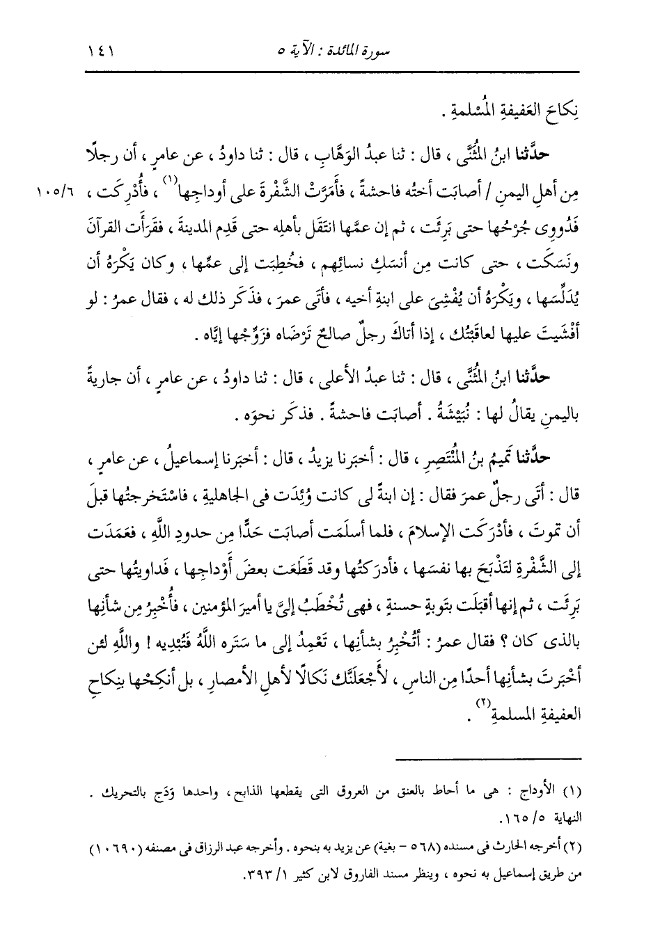 حَدَّثَنَا ابْنُ الْمُثَنَّى , قَالَ: ثنا عَبْدُ الْوَهَّابِ , قَالَ: ثنا دَاوُدُ , عَنْ عَامِرٍ: أَنَّ رَجُلًا , مِنْ أَهْلِ الْيَمَنِ أَصَابَتْ أُخْتُهُ فَاحِشَةً , فَأَمَرَّتِ الشَّفْرَةَ عَلَى أَوْدَاجِهَا , فَأُدْرِكَتْ , فَدُووِيَ جُرْحُهَا حَتَّى بَرِئَتْ , ثُمَّ إِنَّ عَمَّهَا انْتَقَلَ بِأَهْلِهِ حَتَّى قَدِمَ الْمَدِينَةَ , فَقَرَأَتِ الْقُرْآنَ وَنَسَكَتْ , حَتَّى كَانَتْ مِنْ أَنْسَكِ نِسَائِهِمْ , فَخُطِبَتْ إِلَى عَمِّهَا , وَكَانَ يَكْرَهُ أَنْ يُدَلِّسَهَا , وَيَكْرَهُ أَنْ يُفْشِيَ عَلَى ابْنَةِ أَخِيهِ , فَأَتَى عُمَرَ , فَذَكَرَ ذَلِكَ لَهُ , فَقَالَ عُمَرُ: «§لَوْ أَفْشَيْتَ عَلَيْهَا لَعَاقَبْتُكَ , إِذَا أَتَاكَ رَجُلٌ صَالِحٌ تَرْضَاهُ فَزَوِّجْهَا إِيَّاهُ» حَدَّثَنَا ابْنُ الْمُثَنَّى قَالَ: ثنا عَبْدُ الْأَعْلَى , قَالَ: ثنا دَاوُدُ , عَنْ عَامِرٍ: أَنَّ جَارِيَةً بِالْيَمَنِ يُقَالَ لَهَا نُبَيْشَةُ , أَصَابَتْ فَاحِشَةً , فَذَكَرَ نَحْوَهُ