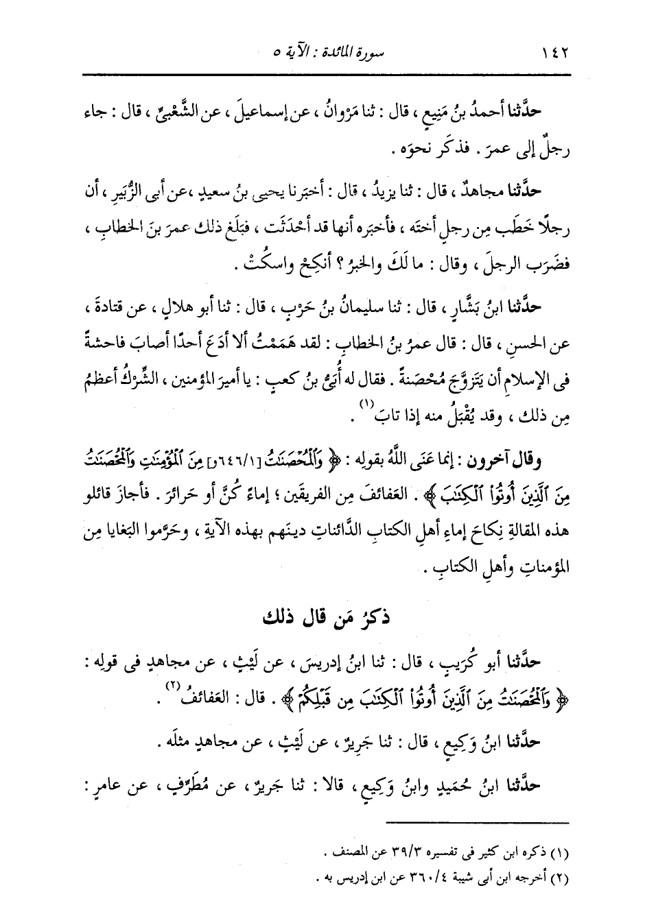 حَدَّثَنَا ابْنُ حُمَيْدٍ , وَابْنُ وَكِيعٍ , قَالَا: ثنا جَرِيرٌ , عَنْ مُطَرِّفٍ , عَنْ عَامِرٍ: {§-[143]- وَالْمُحْصَنَاتُ مِنَ الَّذِينَ أُوتُوا الْكِتَابَ مِنْ قَبْلِكُمْ} [المائدة: 5] قَالَ: " إِحْصَانُ الْيَهُودِيَّةِ وَالنَّصْرَانِيَّةِ: أَنْ لَا تَزْنِيَ وَأَنْ تَغْتَسِلَ مِنَ الْجَنَابَةِ "