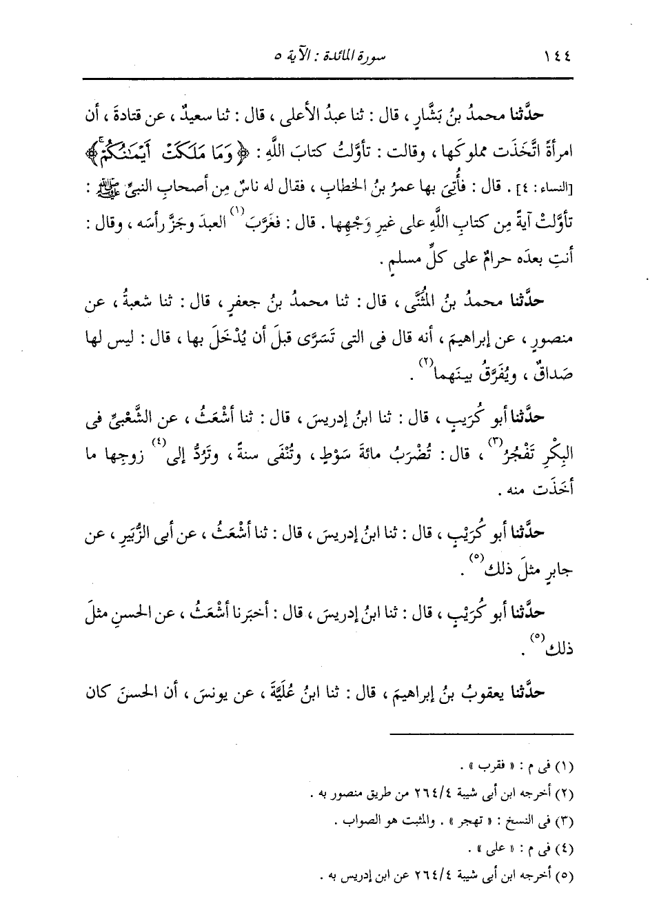 حَدَّثَنَا مُحَمَّدُ بْنُ بَشَّارٍ , قَالَ: ثنا عَبْدُ الْأَعْلَى , قَالَ: ثنا سَعِيدٌ , عَنْ قَتَادَةَ: أَنَّ امْرَأَةً , اتَّخَذَتْ مَمْلُوكَهَا وَقَالَتْ: تَأَوَّلْتُ كِتَابَ اللَّهِ: {وَمَا مَلَكَتْ أَيْمَانُكُمْ} [النساء: 36] قَالَ: " فَأُتِيَ بِهَا عُمَرُ بْنُ الْخَطَّابِ , فَقَالَ لَهُ نَاسٌ مِنْ أَصْحَابِ النَّبِيِّ صَلَّى اللهُ عَلَيْهِ وَسَلَّمَ: تَأَوَّلَتْ آيَةً مِنْ كِتَابِ اللَّهِ عَلَى غَيْرِ وَجْهِهَا. قَالَ: فَقَرَّبَ الْعَبْدَ وَجَزَّ رَأْسَهُ , وَقَالَ: «§أَنْتِ بَعْدَهُ حَرَامٌ عَلَى كُلِّ مُسْلِمٍ»