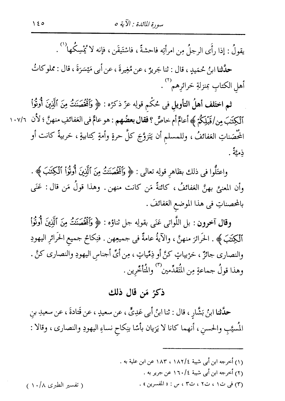 حَدَّثَنَا ابْنُ حُمَيْدٍ , قَالَ: ثنا جَرِيرٌ , عَنْ مُغِيرَةَ , عَنْ أَبِي مَيْسَرَةَ , قَالَ: «§مَمْلُوكَاتُ أَهْلِ الْكِتَابِ بِمَنْزِلَةِ حَرَائِرِهِمْ» ثُمَّ اخْتَلَفَ أَهْلُ التَّأْوِيلِ فِي حُكْمِ قَوْلِهِ عَزَّ ذِكْرُهُ: {وَالْمُحْصَنَاتُ مِنَ الَّذِينَ أُوتُوا الْكِتَابَ مِنْ قَبْلِكُمْ} [المائدة: 5] أَعَامٌّ أَمْ خَاصٌّ؟ فَقَالَ بَعْضُهُمْ: هُوَ عَامٌّ فِي الْعَفَائِفِ مِنْهُنَّ , لِأَنَّ الْمُحْصَنَاتِ الْعَفَائِفُ , وَلِلْمُسْلِمِ أَنْ يَتَزَوَّجَ كُلَّ حُرَّةٍ وَأَمَةٍ كِتَابِيَّةٍ حَرْبِيَّةً كَانَتْ أَوْ ذِمِيَّةً. وَاعْتَلُّوا فِي ذَلِكَ بِظَاهِرِ قَوْلِهِ تَعَالَى: {وَالْمُحْصَنَاتُ مِنَ الَّذِينَ أُوتُوا الْكِتَابَ مِنْ قَبْلِكُمْ} [المائدة: 5] وَأَنَّ الْمَعْنِيَّ بِهِنَّ الْعَفَائِفُ كَائِنَةً مَنْ كَانَتْ مِنْهُنَّ. وَهَذَا قَوْلُ مَنْ قَالَ: عُنِيَ بِالْمُحْصَنَاتِ فِي هَذَا الْمَوْضِعِ: الْعَفَائِفُ. وَقَالَ آخَرُونَ: بَلِ اللَّوَاتِي عَنَى بِقَوْلِهِ جَلَّ ثَنَاؤُهُ: {وَالْمُحْصَنَاتُ مِنَ الَّذِينَ أُوتُوا الْكِتَابَ مِنْ قَبْلِكُمْ} [المائدة: 5] الْحَرَائِرُ مِنْهُنَّ , وَالْآيَةُ عَامَّةٌ فِي جَمِيعِهِنَّ , فَنِكَاحُ جَمِيعِ الْحَرَائِرِ الْيَهُودِ وَالنَّصَارَى جَائِزٌ , حَرْبِيَّاتٍ كُنَّ أَوْ ذِمِّيَّاتٍ , مِنْ أَيِّ أَجْنَاسِ الْيَهُودِ وَالنَّصَارَى كُنَّ وَهَذَا قَوْلُ جَمَاعَةٍ مِنَ الْمُتَقَدِّمِينَ وَالْمُتَأَخِّرِينَ