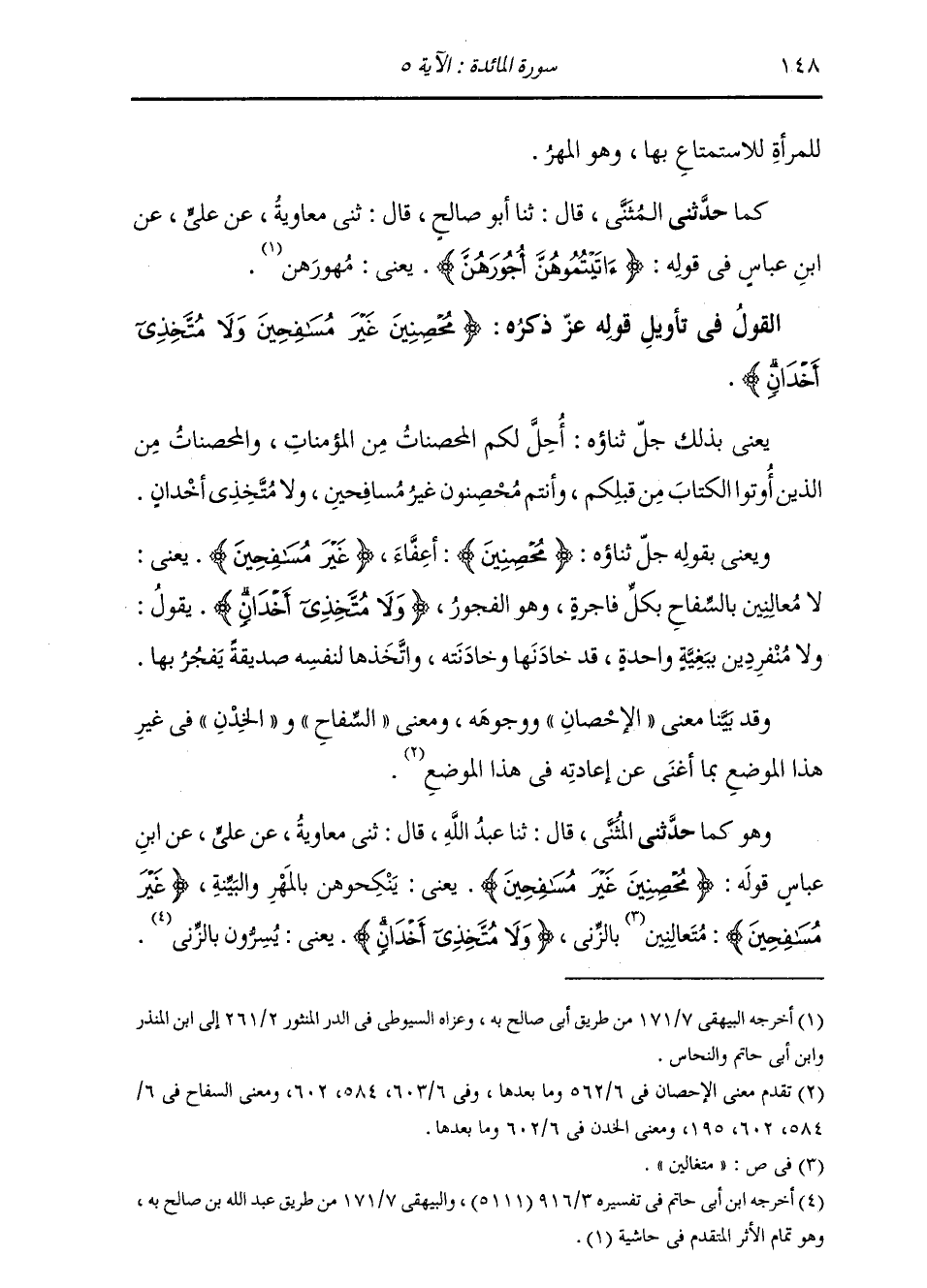 حَدَّثَنِي الْمُثَنَّى , قَالَ: ثنا عَبْدُ اللَّهِ , قَالَ: ثني مُعَاوِيَةُ , عَنْ عَلِيٍّ , عَنِ ابْنِ عَبَّاسٍ , قَوْلُهُ: {§مُحْصِنِينَ غَيْرَ مُسَافِحِينَ} [النساء: 24] يَعْنِي: " يَنْكِحُوهُنَّ بِالْمَهْرِ وَالْبَيِّنَةِ {غَيْرَ مُسَافِحِينَ} [المائدة: 5] مُتَعَالِنِينَ بِالزِّنَا {وَلَا مُتَّخِذِي أَخْدَانٍ} [المائدة: 5] يَعْنِي: «يُسِرُّونَ بِالزِّنَا»