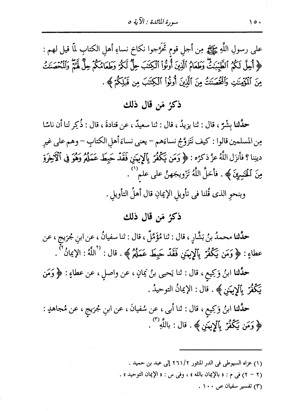 حَدَّثَنَا ابْنُ وَكِيعٍ , قَالَ: ثنا أَبِي , عَنْ سُفْيَانَ , عَنِ ابْنِ جُرَيْجٍ , عَنْ مُجَاهِدٍ: {§وَمَنْ يَكْفُرْ بِالْإِيمَانِ} [المائدة: 5] قَالَ: «بِاللَّهِ» -[151]- حَدَّثَنَا ابْنُ وَكِيعٍ , قَالَ: ثنا يَحْيَى , عَنْ سُفْيَانَ , عَنِ ابْنِ جُرَيْجٍ , عَنْ مُجَاهِدٍ , مِثْلَهُ