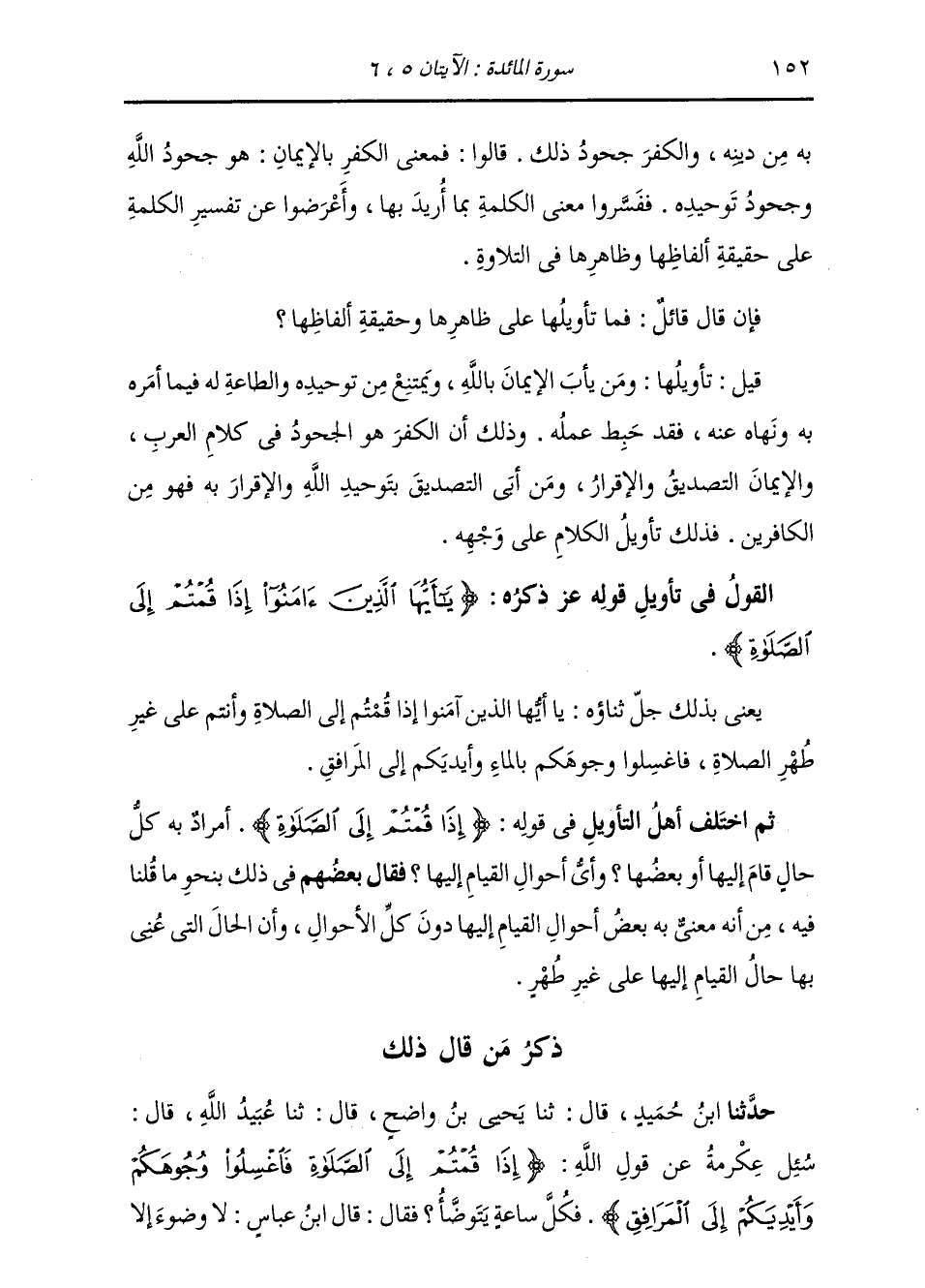 §الْقَوْلُ فِي تَأْوِيلِ قَوْلِهِ تَعَالَى: {يَا أَيُّهَا الَّذِينَ آمَنُوا إِذَا قُمْتُمْ إِلَى الصَّلَاةَ فَاغْسِلُوا وُجُوهَكُمْ وَأَيْدِيَكُمْ إِلَى الْمَرَافِقِ وَامْسَحُوا بِرُءُوسِكُمْ وَأَرْجُلَكُمْ إِلَى الْكَعْبَيْنِ وَإِنْ كُنْتُمْ جُنُبًا فَاطَّهَرُوا وَإِنْ كُنْتُمْ مَرْضَى أَوْ عَلَى سَفَرٍ أَوْ جَاءَ أَحَدٌ مِنْكُمْ مِنَ الْغَائِطِ أَوْ لَامَسْتُمُ النِّسَاءَ فَلَمْ تَجِدُوا مَاءً فَتَيَمَّمُوا صَعِيدًا طَيِّبًا فَامْسَحُوا بُوُجُوهِكُمْ وَأَيْدِيكُمْ مِنْهُ مَا يُرِيدُ اللَّهُ لِيَجْعَلَ عَلَيْكُمْ مِنْ حَرَجٍ وَلَكِنْ يُرِيدُ لِيُطَهِّرَكُمْ وَلِيُتِمَّ نِعْمَتَهُ عَلَيْكُمْ لَعَلَّكُمْ تَشْكُرُونَ} يَعْنِي بِذَلِكَ جَلَّ ثَنَاؤُهُ: يَا أَيُّهَا الَّذِينَ آمَنُوا إِذَا قُمْتُمْ إِلَى الصَّلَاةَ وَأَنْتُمْ عَلَى غَيْرِ طُهْرِ الصَّلَاةِ , فَاغْسِلُوا وُجُوهَكُمْ بِالْمَاءِ , وَأَيْدِيَكُمْ إِلَى الْمَرَافِقِ. ثُمَّ اخْتَلَفَ أَهْلُ التَّأْوِيلِ فِي قَوْلِهِ: {إِذَا قُمْتُمْ إِلَى الصَّلَاةَ} [المائدة: 6] أَمُرَادٌ بِهِ كُلُّ حَالٍ قَامَ إِلَيْهَا , أَوْ بَعْضُهَا؟ وَأَيُّ أَحْوَالِ الْقِيَامِ إِلَيْهَا؟ فَقَالَ بَعْضُهُمْ فِي ذَلِكَ بِنَحْوِ مَا قُلْنَا فِيهِ مِنْ أَنَّهُ مَعْنِيٌّ بِهِ بَعْضُ أَحْوَالِ الْقِيَامِ إِلَيْهَا دُونَ كُلِّ الْأَحْوَالِ , وَأَنَّ الْحَالَ الَّتِي عَنَى بِهَا حَالُ الْقِيَامِ إِلَيْهَا عَلَى غَيْرِ طُهْرٍ