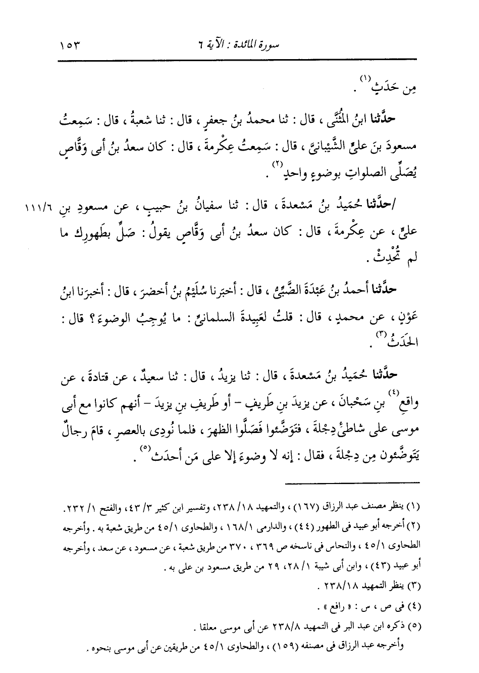حَدَّثَنَا حُمَيْدُ بْنُ مَسْعَدَةَ , قَالَ: ثنا يَزِيدُ , قَالَ: ثنا سَعِيدٌ , عَنْ قَتَادَةَ , عَنْ وَاقِعِ بْنِ سَحْبَانَ , عَنْ يَزِيدَ بْنِ طَرِيفٍ , أَوْ طَرِيفِ بْنِ يَزِيدَ أَنَّهُمْ كَانُوا مَعَ أَبِي مُوسَى عَلَى شَاطِئِ دِجْلَةَ , فَتَوَضَّئُوا فَصَلُّوا الظُّهْرَ , فَلَمَّا نُودِيَ بِالْعَصْرِ , قَامَ رِجَالٌ يَتَوَضَّئُونَ مِنْ دِجْلَةَ , فَقَالَ: «§إِنَّهُ لَا وُضُوءَ إِلَّا عَلَى مَنْ أَحْدَثَ»