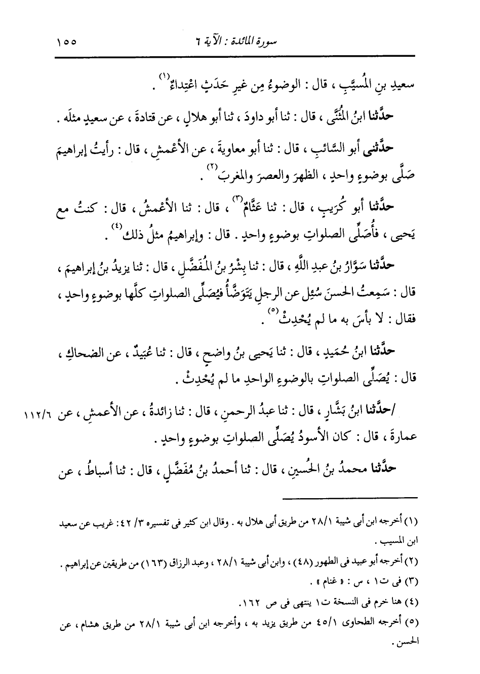 حَدَّثَنِي أَبُو السَّائِبِ , قَالَ: ثنا أَبُو مُعَاوِيَةَ , عَنِ الْأَعْمَشِ , قَالَ: «رَأَيْتُ إِبْرَاهِيمَ §صَلَّى بِوُضُوءٍ وَاحِدٍ الظُّهْرَ وَالْعَصْرَ وَالْمَغْرِبَ»