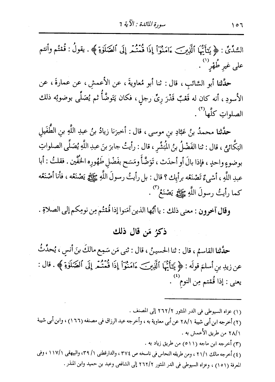 ذِكْرُ مَنْ قَالَ ذَلِكَ: حَدَّثَنَا الْقَاسِمُ , قَالَ: ثنا الْحُسَيْنُ , قَالَ: ثني مَنْ سَمِعَ مَالِكَ بْنَ أَنَسٍ , يُحَدِّثُ عَنْ زَيْدِ بْنِ أَسْلَمَ , قَوْلُهُ: {§يَا أَيُّهَا الَّذِينَ آمَنُوا إِذَا قُمْتُمْ إِلَى الصَّلَاةِ} [المائدة: 6] قَالَ: " يَعْنِي: إِذَا قُمْتُمْ مِنَ النَّوْمِ " -[157]- حَدَّثَنِي يُونُسُ , قَالَ: أَخْبَرَنَا ابْنُ وَهْبٍ أَنَّ مَالِكَ بْنَ أَنَسٍ , أَخْبَرَهُ عَنْ زَيْدِ بْنِ أَسْلَمَ , بِمِثْلِهِ