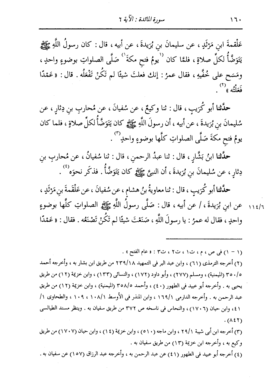 حَدَّثَنَا أَبُو كُرَيْبٍ , قَالَ: ثنا وَكِيعٌ , عَنْ سُفْيَانَ , عَنْ مُحَارِبِ بْنِ دِثَارٍ , عَنْ سُلَيْمَانَ بْنِ بُرَيْدَةَ , عَنْ أَبِيهِ: أَنَّ رَسُولَ اللَّهِ صَلَّى اللهُ عَلَيْهِ وَسَلَّمَ كَانَ §يَتَوَضَّأُ لِكُلِّ صَلَاةٍ , فَلَمَّا كَانَ يَوْمُ فَتْحِ مَكَّةَ , صَلَّى الصَّلَوَاتِ كُلَّهَا بِوَضُوءٍ وَاحِدٍ " حَدَّثَنَا ابْنُ بَشَّارٍ , قَالَ: ثنا عَبْدُ الرَّحْمَنِ , قَالَ: ثنا سُفْيَانُ , عَنْ مُحَارِبِ بْنِ دِثَارٍ , عَنْ سُلَيْمَانَ بْنِ بُرَيْدَةَ: أَنَّ النَّبِيَّ صَلَّى اللهُ عَلَيْهِ وَسَلَّمَ كَانَ يَتَوَضَّأُ , فَذَكَرَ نَحْوَهُ