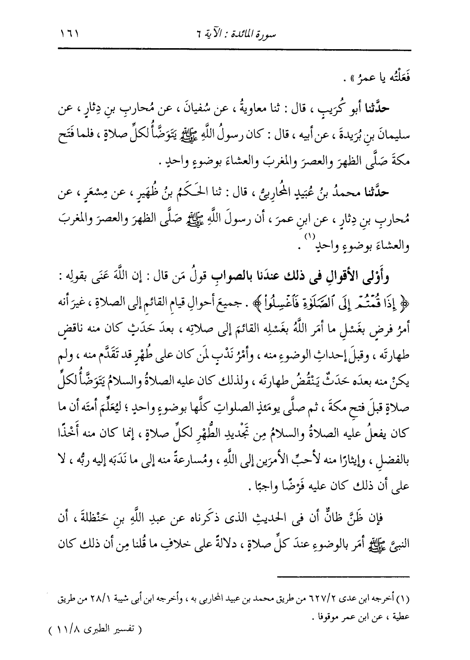 حَدَّثَنَا مُحَمَّدُ بْنُ عُبَيْدٍ الْمُحَارِبِيُّ , قَالَ: ثنا الْحَكَمُ بْنُ ظُهَيْرٍ , عَنْ مِسْعَرٍ , عَنْ مُحَارِبِ بْنِ دِثَارٍ , عَنِ ابْنِ عُمَرَ: أَنَّ رَسُولَ اللَّهِ صَلَّى اللهُ عَلَيْهِ وَسَلَّمَ §صَلَّى الظُّهْرَ وَالْعَصْرَ وَالْمَغْرِبَ وَالْعِشَاءَ بِوُضُوءٍ وَاحِدٍ " فَإِنْ ظَنَّ ظَانٌّ أَنَّ فِي الْحَدِيثِ الَّذِي ذَكَرْنَاهُ عَنْ عَبْدِ اللَّهِ بْنِ حَنْظَلَةَ , أَنَّ النَّبِيَّ صَلَّى اللهُ عَلَيْهِ وَسَلَّمَ أَمَرَ بِالْوُضُوءِ عِنْدَ كُلِّ صَلَاةٍ , دَلَالَةٌ عَلَى خِلَافِ مَا قُلْنَا مِنْ أَنَّ ذَلِكَ كَانَ -[162]- نَدْبًا لِلنَّبِيِّ عَلَيْهِ الصَّلَاةُ وَالسَّلَامُ وَأَصْحَابِهِ , وَخُيِّلَ إِلَيْهِ أَنَّ ذَلِكَ كَانَ عَلَى الْوُجُوبِ؛ فَقَدْ ظَنَّ غَيْرَ الصَّوَابِ , وَذَلِكَ أَنَّ قَوْلَ الْقَائِلِ: أَمَرَ اللَّهُ نَبِيَّهُ صَلَّى اللهُ عَلَيْهِ وَسَلَّمَ بِكَذَا وَكَذَا , مُحْتَمَلٌ مِنْ وُجُوهٍ لِأَمْرِ الْإِيجَابِ وَالْأَرْشَادِ وَالنَّدْبِ وَالْإِبَاحَةِ وَالْإِطْلَاقِ , وَإِذْ كَانَ مُحْتَمِلًا مَا ذَكَرْنَا مِنَ الْأَوْجُهِ , كَانَ أَوْلَى وُجُوهِهِ بِهِ مَا عَلَى صِحَّتِهِ الْحُجَّةُ مُجْمِعَةٌ دُونَ مَا لَمْ يَكُنْ عَلَى صِحَّتِهِ بُرْهَانٌ يُوجِبُ حَقِّيَّةَ مُدَّعِيهِ. وَقَدْ أَجْمَعَتِ الْحُجَّةُ عَلَى أَنَّ اللَّهَ عَزَّ وَجَلَّ لَمْ يُوجِبْ عَلَى نَبِيِّهِ صَلَّى اللهُ عَلَيْهِ وَسَلَّمَ وَلَا عَلَى عِبَادِهِ فَرْضَ الْوُضُوءِ لِكُلِّ صَلَاةٍ , ثُمَّ نُسِخَ ذَلِكَ , فَفِي إِجْمَاعِهَا عَلَى ذَلِكَ الدَّلَالَةُ الْوَاضِحَةُ عَلَى صِحَّةِ مَا قُلْنَا مِنْ أَنَّ فِعْلَ النَّبِيِّ صَلَّى اللهُ عَلَيْهِ وَسَلَّمَ مَا كَانَ يَفْعَلُ مِنْ ذَلِكَ كَانَ عَلَى مَا وَصَفْنَا مِنْ إِيثَارِهِ فِعْلَ مَا نَدَبَهُ اللَّهُ عَزَّ ذِكْرُهُ إِلَى فِعْلِهِ وَنَدَبَ إِلَيْهِ عِبَادَهُ الْمُؤْمِنِينَ بِقَوْلِهِ: {يَا أَيُّهَا الَّذِينَ آمَنُوا إِذَا قُمْتُمْ إِلَى الصَّلَاةِ فَاغْسِلُوا وُجُوهَكُمْ وَأَيْدِيَكُمْ إِلَى الْمَرَافِقِ} [المائدة: 6] الْآيَةُ , وَأَنَّ تَرْكَهُ فِي ذَلِكَ الْحَالِ الَّتِي تَرَكَهُ كَانَ تَرْخِيصًا لِأُمَّتِهِ وَإِعْلَامًا مِنْهُ لَهُمْ أَنَّ ذَلِكَ غَيْرُ وَاجِبٍ وَلَا لَازِمٍ لَهُ وَلَا لَهُمْ , إِلَّا مَنْ حَدَثٍ يُوجِبُ نَقْضَ الطُّهْرِ. وَقَدْ رُوِيَ بِنَحْو مَا قُلْنَا فِي ذَلِكَ أَخْبَارٌ: