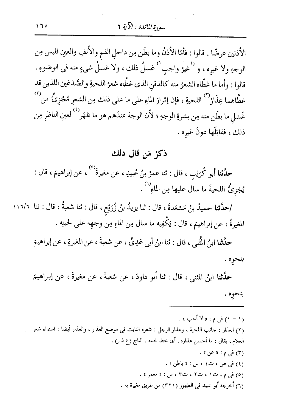 ذِكْرُ مَنْ قَالَ ذَلِكَ: حَدَّثَنَا أَبُو كُرَيْبٍ , قَالَ: ثنا عُمَرُ بْنُ عُبَيْدٍ , عَنْ مَعْمَرٍ , عَنْ إِبْرَاهِيمَ , قَالَ: «§يُجْزِئُ اللِّحْيَةَ مَا سَالَ عَلَيْهَا مِنَ الْمَاءِ»