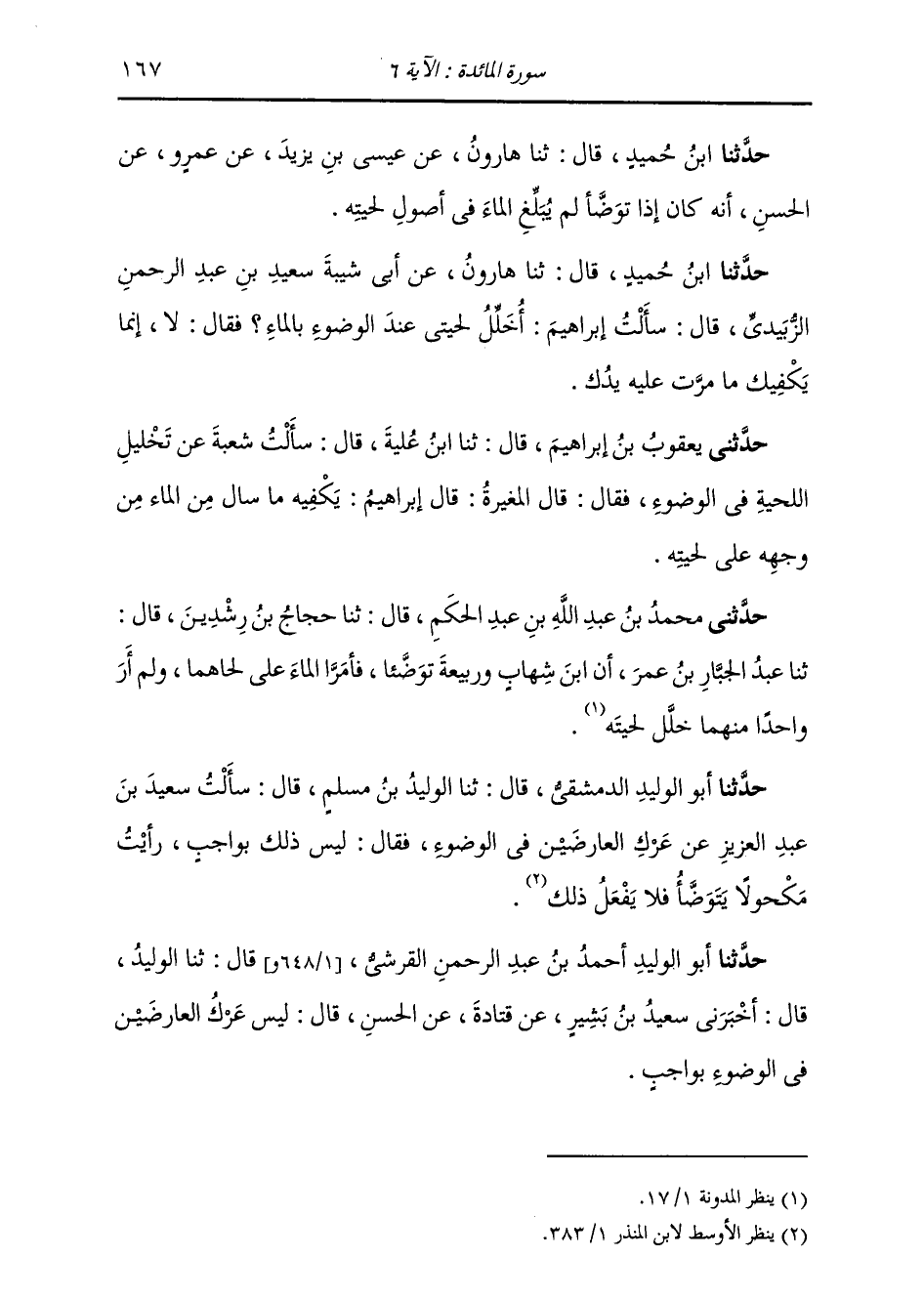 حَدَّثَنَا ابْنُ حُمَيْدٍ , قَالَ: ثنا هَارُونُ , عَنْ أَبِي شَيْبَةَ سَعِيدِ بْنِ عَبْدِ الرَّحْمَنِ الزُّبَيْدِيِّ , قَالَ: سَأَلْتُ إِبْرَاهِيمَ §أُخَلِّلُ لِحْيَتِي عِنْدَ الْوُضُوءِ بِالْمَاءِ؟ فَقَالَ: لَا , إِنَّمَا يَكْفِيكَ مَا مَرَّتْ عَلَيْهِ يَدُكَ "