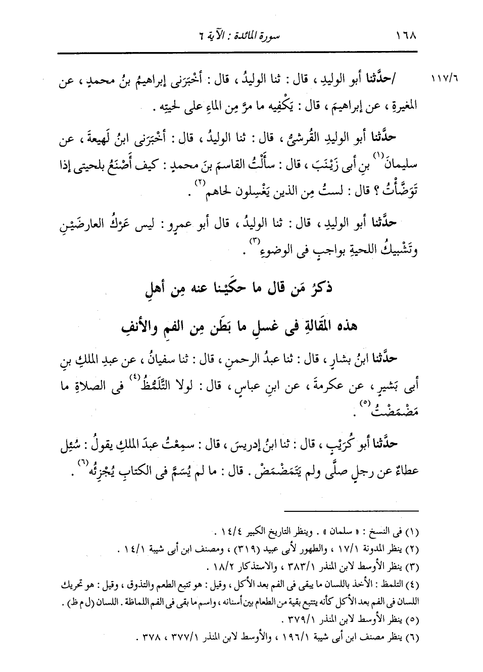 حَدَّثَنَا أَبُو الْوَلِيدِ الْقُرَشِيُّ , قَالَ: ثنا الْوَلِيدُ , قَالَ: أَخْبَرَنِي ابْنُ لَهِيعَةَ , عَنْ سُلَيْمَانَ بْنِ أَبِي زَيْنَبَ , قَالَ: سَأَلْتُ الْقَاسِمَ بْنَ مُحَمَّدٍ كَيْفَ أَصْنَعُ بِلِحْيَتِي إِذَا تَوَضَّأْتُ؟ قَالَ: «§لَسْتُ مِنَ الَّذِينَ يَغْسِلُونَ لِحَاهُمْ»
