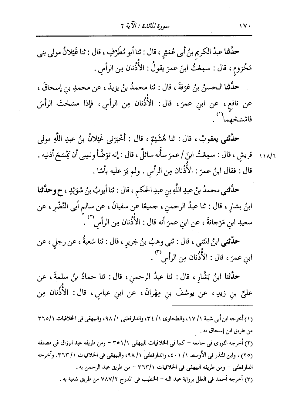 حَدَّثَنَا عَبْدُ الْكَرِيمِ بْنُ أَبِي عُمَيْرٍ , قَالَ: ثنا أَبُو مُطَرِّفٍ , قَالَ: ثنا غَيْلَانُ , مَوْلَى بَنِي مَخْزُومٍ , قَالَ: سَمِعْتُ ابْنَ عُمَرَ , يَقُولُ: «§الْأُذُنَانِ مِنَ الرَّأْسِ»