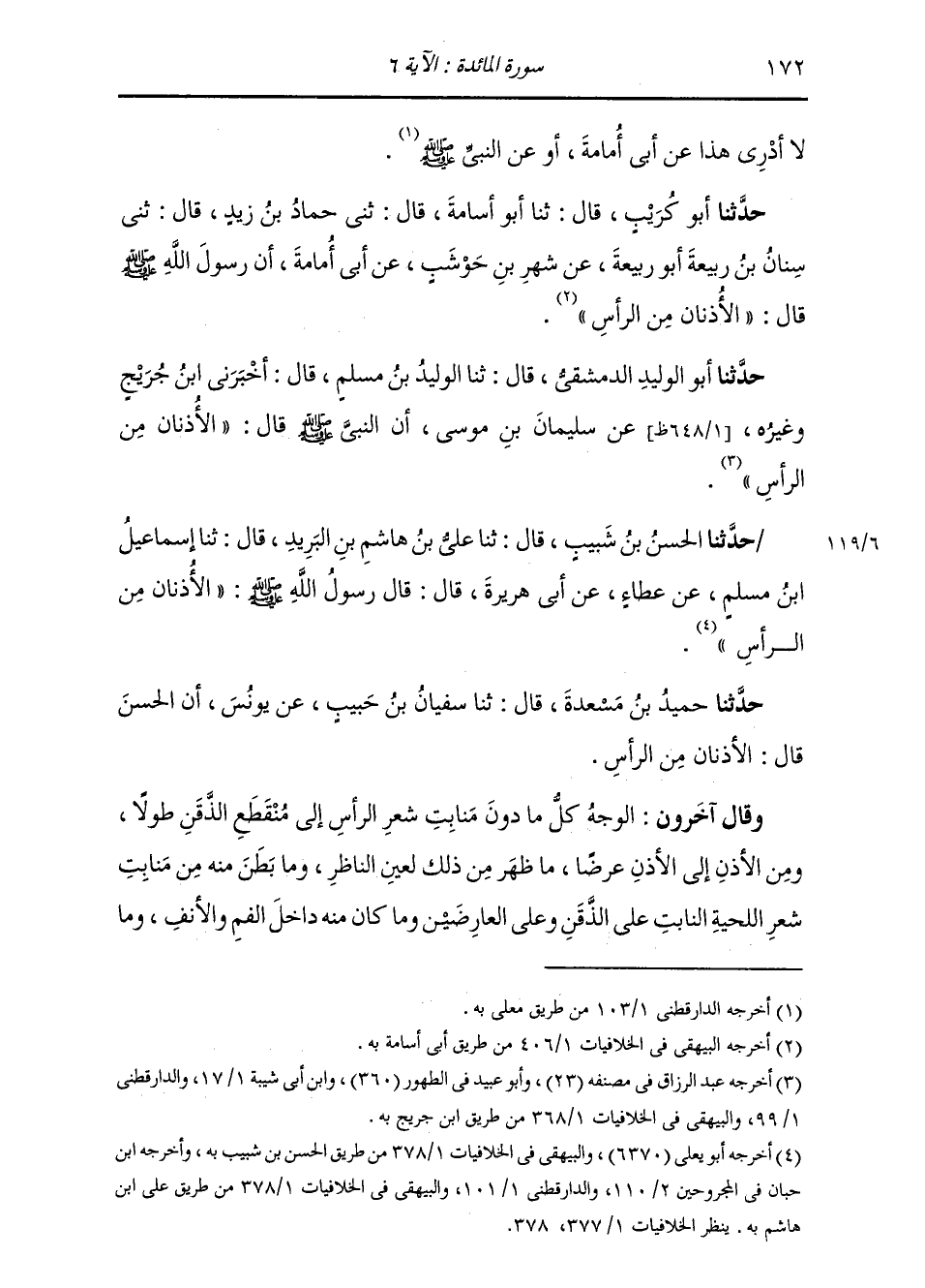 حَدَّثَنَا أَبُو كُرَيْبٍ , قَالَ: ثنا أَبُو أُسَامَةَ , قَالَ: ثني حَمَّادُ بْنُ زَيْدٍ , قَالَ: ثني سِنَانُ بْنُ رَبِيعَةَ أَبُو رَبِيعَةَ , عَنْ شَهْرِ بْنِ حَوْشَبٍ , عَنْ أَبِي أُمَامَةَ , أَنَّ رَسُولَ اللَّهِ صَلَّى اللهُ عَلَيْهِ وَسَلَّمَ قَالَ: «§الْأُذُنَانِ مِنَ الرَّأْسِ»