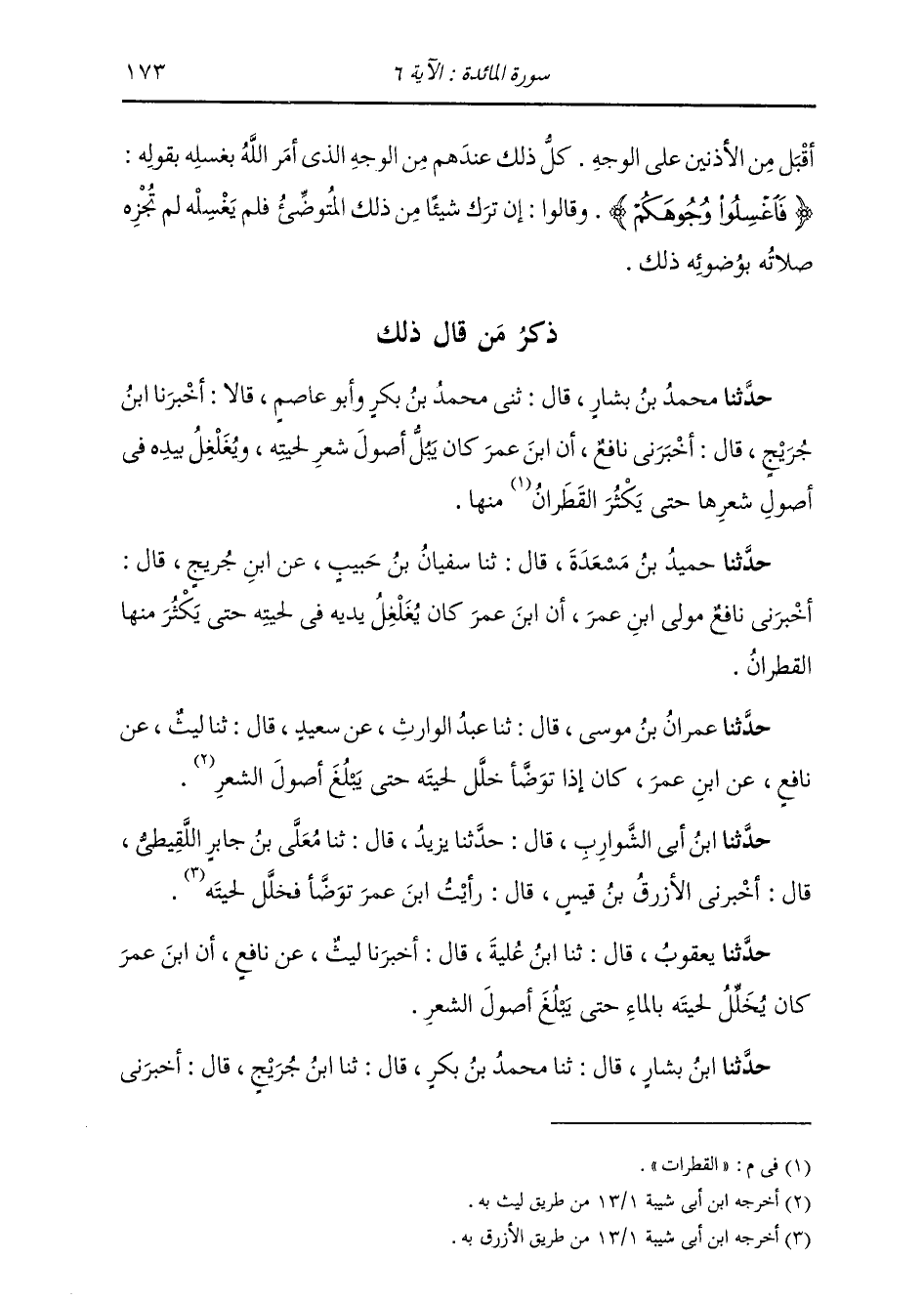 حَدَّثَنَا حُمَيْدُ بْنُ مَسْعَدَةَ , قَالَ: ثنا سُفْيَانُ بْنُ حَبِيبٍ , عَنِ ابْنِ جُرَيْجٍ , قَالَ: أَخْبَرَنِي نَافِعٌ مَوْلَى ابْنِ عُمَرَ: أَنَّ ابْنَ عُمَرَ كَانَ §يُغَلْغِلُ يَدَيْهِ فِي لِحْيَتِهِ حَتَّى تَكْثُرَ مِنْهَا الْقَطَرَاتِ "