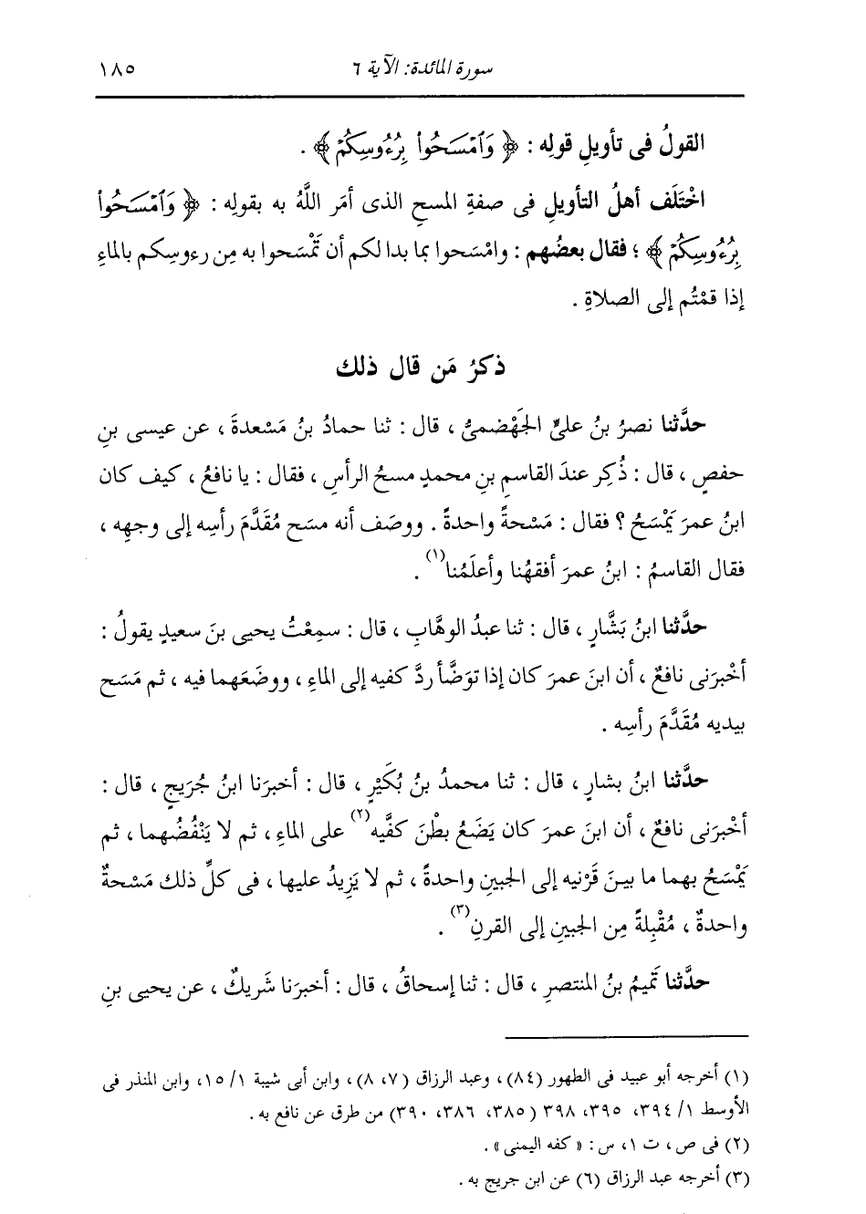 §الْقَوْلُ فِي تَأْوِيلِ قَوْلِهِ تَعَالَى: وَامْسَحُوا بِرُءُوسِكُمْ اخْتَلَفَ أَهْلُ التَّأْوِيلِ فِي صِفَةِ الْمَسْحِ الَّذِي أَمَرَ اللَّهُ بِهِ بِقَوْلِهِ: وَامْسَحُوا بِرُءُوسِكُمْ فَقَالَ بَعْضُهُمْ: وَامْسَحُوا بِمَا بَدَا لَكُمْ أَنْ تَمْسَحُوا بِهِ مِنْ رُءُوسِكُمْ بِالْمَاءِ إِذَا قُمْتُمْ إِلَى الصَّلَاةِ