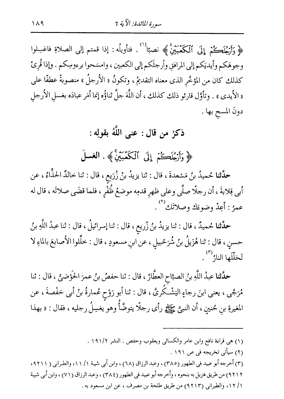 §ذِكْرُ مَنْ قَالَ: عَنَى اللَّهُ بِقَوْلِهِ: وَأَرْجُلَكُمْ إِلَى الْكَعْبَيْنِ الْغُسْلَ: