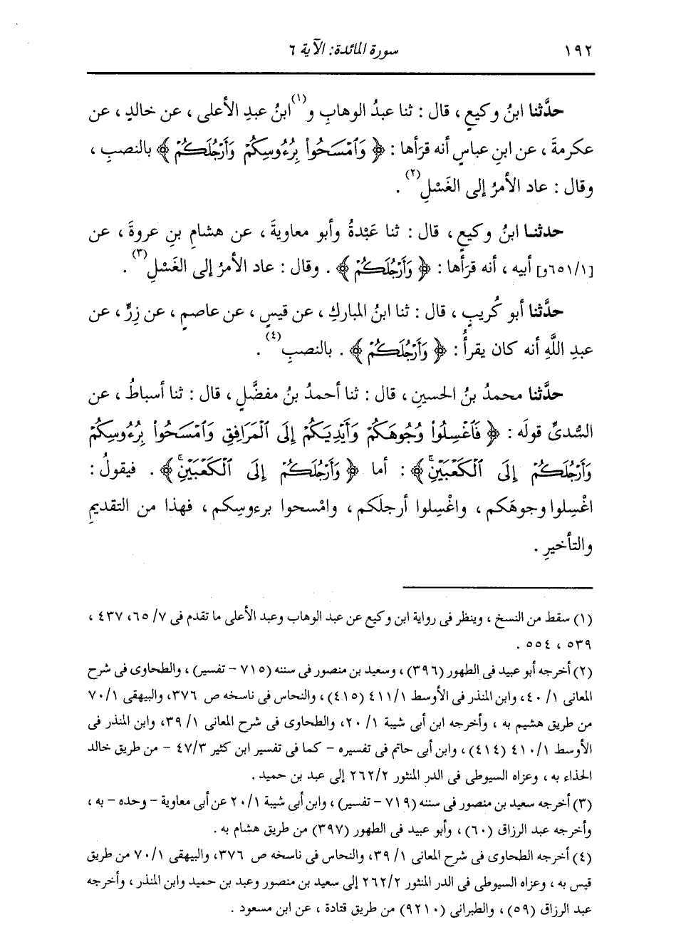 حَدَّثَنَا ابْنُ وَكِيعٍ , قَالَ: ثنا عَبْدُ الْوَهَّابِ وَعَبْدُ الْأَعْلَى , عَنْ خَالِدٍ , عَنْ عِكْرِمَةَ , عَنِ ابْنِ عَبَّاسٍ , أَنَّهُ قَرَأَهَا: {§وَامْسَحُوا بِرُءُوسِكُمْ وَأَرْجُلَكُمْ} بِالنَّصْبِ , وَقَالَ: عَادَ الْأَمْرِ إِلَى الْغُسْلِ "