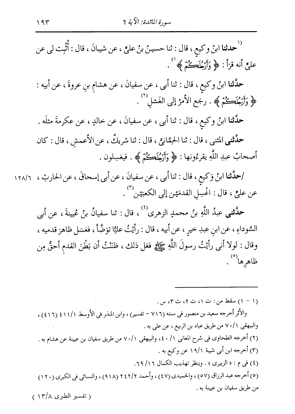 ثَنا ابْنُ وَكِيعٍ , قَالَ: ثنا أَبِي , عَنْ سُفْيَانَ , عَنْ هِشَامِ بْنِ عُرْوَةَ , عَنْ أَبِيهِ: {§وَأَرْجُلَكُمْ} [المائدة: 6] رَجَعَ الْأَمْرُ إِلَى الْغُسْلِ " حَدَّثَنَا ابْنُ وَكِيعٍ , قَالَ: ثنا أَبِي , عَنْ سُفْيَانَ , عَنْ خَالِدٍ , عَنْ عِكْرِمَةَ , مِثْلَهُ