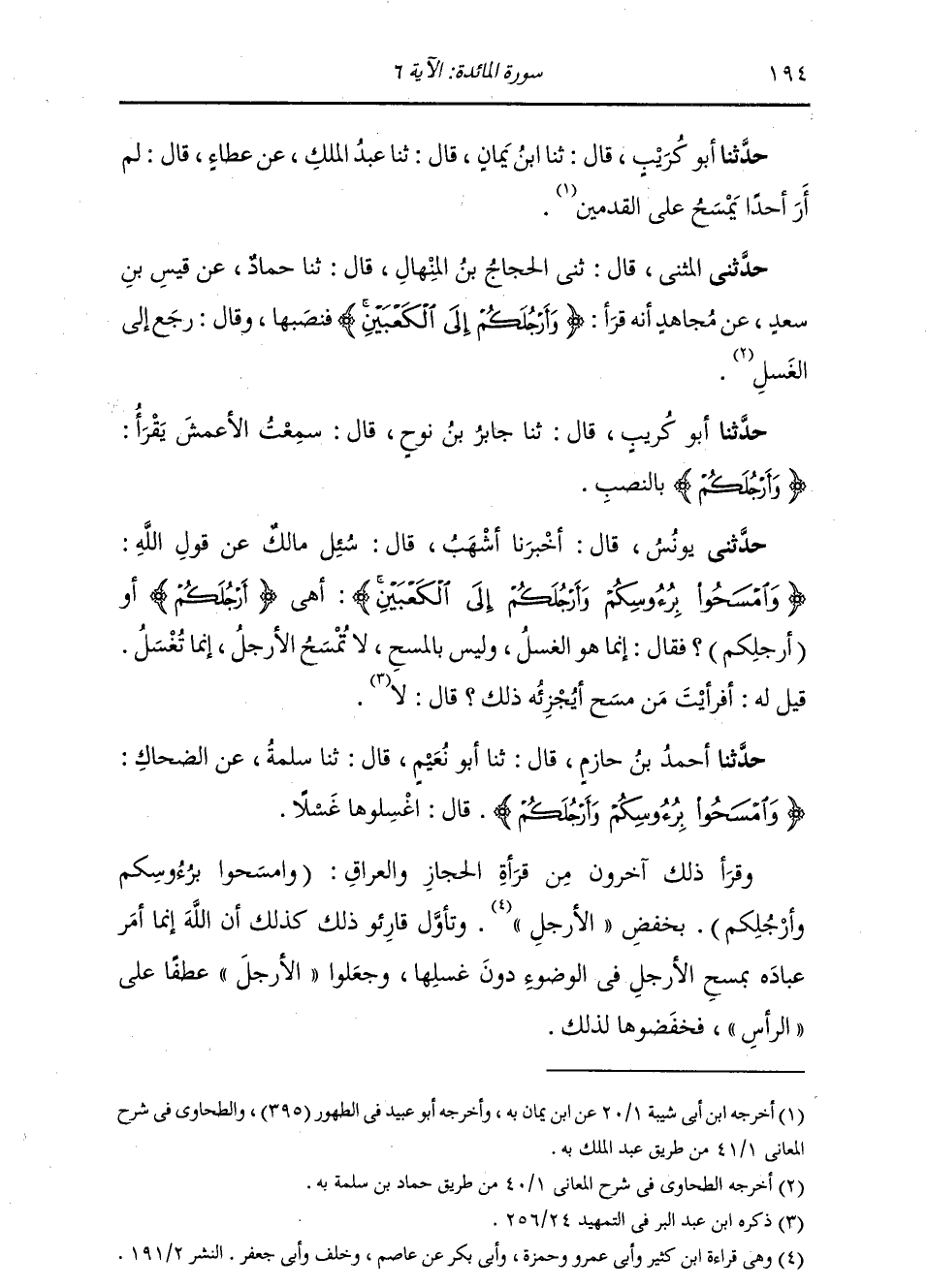 حَدَّثَنَا أَحْمَدُ بْنُ حَازِمٍ , قَالَ: ثنا أَبُو نُعَيْمٍ , قَالَ: ثنا سَلَمَةُ , عَنِ الضَّحَّاكِ: {§وَامْسَحُوا بِرُءُوسِكُمْ وَأَرْجُلَكُمْ} قَالَ: «اغْسِلُوهَا غُسْلًا» وَقَرَأَ ذَلِكَ آخَرُونَ مِنْ قُرَّاءِ الْحِجَازِ وَالْعِرَاقِ: «وَامْسَحُوا بِرُءُوسِكُمْ وَأَرْجُلِكُمْ» بِخَفْضِ الْأَرْجُلِ. وتَأَوَّلَ قَارِئُو ذَلِكَ كَذَلِكَ أَنَّ اللَّهَ إِنَّمَا أَمَرَ عِبَادَهُ بِمَسْحِ الْأَرْجُلِ فِي الْوُضُوءِ دُونَ غُسْلِهَا , وَجَعَلُوا الْأَرْجُلَ عَطْفًا عَلَى الرَّأْسِ , فَخَفَضُوهَا لِذَلِكَ