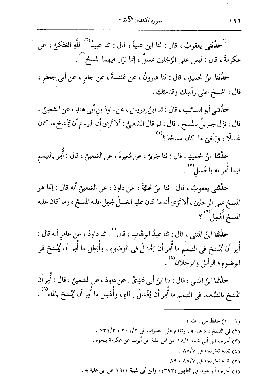 حَدَّثَنِي أَبُو السَّائِبِ , قَالَ: ثنا ابْنُ إِدْرِيسَ , عَنْ دَاوُدَ بْنِ أَبِي هِنْدٍ , عَنِ الشَّعْبِيِّ , قَالَ: نَزَلَ جِبْرِيلُ بِالْمَسْحِ. قَالَ: ثُمَّ قَالَ الشَّعْبِيُّ: «أَلَا تَرَى أَنَّ التَّيَمُّمَ أَنْ §يُمْسَحَ مَا كَانَ غُسْلًا وَيُلْغَى مَا كَانَ مَسْحًا»