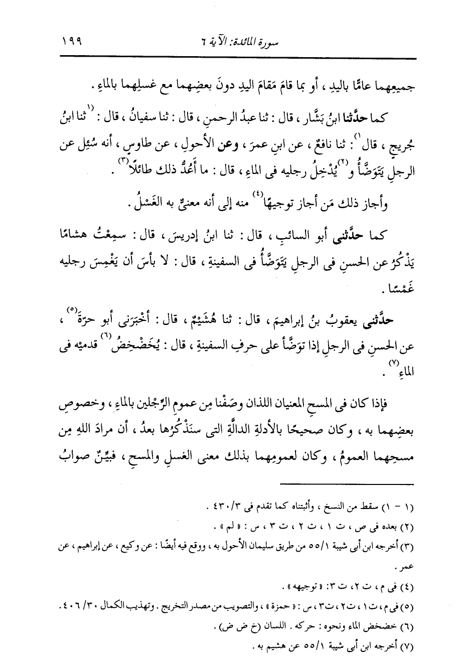 حَدَّثَنِي يَعْقُوبُ بْنُ إِبْرَاهِيمَ , قَالَ: ثنا هُشَيْمٌ , قَالَ: أَخْبَرَنِي أَبُو حُرَّةَ , عَنِ الْحَسَنِ , فِي الرَّجُلِ إِذَا §تَوَضَّأَ عَلَى حَرْفِ السَّفِينَةِ , قَالَ: «يُخَضْخِضُ قَدَمَيْهِ فِي الْمَاءِ» فَإِذَا كَانَ فِي الْمَسْحِ الْمَعْنَيَانِ اللَّذَانِ وَصَفْنَا مِنْ عُمُومِ الرِّجْلَيْنِ بِالْمَاءِ , وَخُصُوصُ بَعْضِهِمَا بِهِ , وَكَانَ صَحِيحًا بِالْأَدِلَّةِ الدَّالَّةِ الَّتِي سَنَذْكُرُهَا بَعْدُ أَنَّ مُرَادَ اللَّهِ مِنْ مَسْحِهِمَا الْعُمُومُ , وَكَانَ لِعُمُومِهِمَا بِذَلِكَ مَعْنَى الْغُسْلِ وَالْمَسْحِ؛ فَبَيَّنَ صَوَابَ
