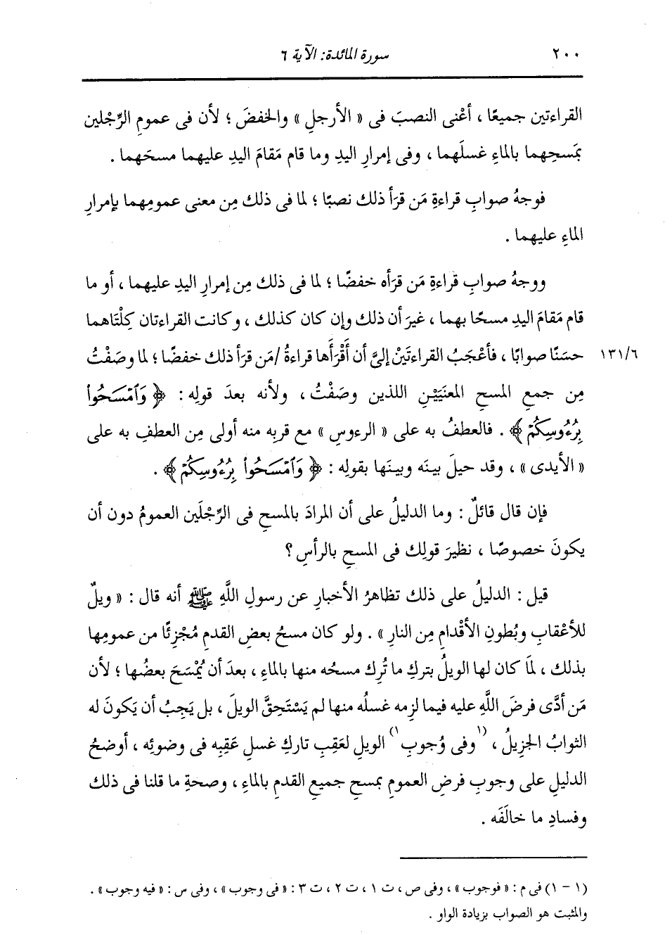 الْقِرَاءَتَيْنِ جَمِيعًا , أَعْنِي النَّصَبَ فِي الْأَرْجِلِ وَالْخَفْضَ , لِأَنَّ فِي عُمُومِ الرِّجْلَيْنِ بَمَسْحِهِمَا بِالْمَاءِ غُسْلَهُمَا , وَفِي إِمْرَارِ الْيَدِ وَمَا قَامَ مَقَامَ الْيَدِ عَلَيْهِمَا مَسْحُهُمَا , فَوَجْهُ صَوَابِ قِرَاءَةِ مَنْ قَرَأَ ذَلِكَ نَصَبًا لِمَا فِي ذَلِكَ مِنْ مَعْنَى عُمُومِهِمَا بِإِمْرَارِ الْمَاءِ عَلَيْهِمَا. وَوَجْهُ صَوَابِ قِرَاءَةِ مَنْ قَرَأَهُ خَفْضًا لِمَا فِي ذَلِكَ مِنْ إِمْرَارِ الْيَدِ عَلَيْهِمَا , أَوْ مَا قَامَ مَقَامَ الْيَدِ مَسْحًا بِهِمَا. غَيْرَ أَنَّ ذَلِكَ وَإِنْ كَانَ كَذَلِكَ وَكَانَتِ الْقِرَاءَتَانِ كِلْتَاهُمَا حَسَنًا صَوَابًا , فَأَعْجَبُ الْقِرَاءَتَيْنِ إِلَيَّ أَنْ أَقْرَأَهَا قِرَاءَةُ مَنْ قَرَأَ ذَلِكَ خَفْضًا لِمَا وَصَفْتُ مِنْ جَمْعِ الْمَسْحِ الْمَعْنَيَيْنِ اللَّذَيْنِ وَصَفْتُ , وَلِأَنَّهُ بَعْدَ قَوْلِهِ: {وَامْسَحُوا بِرُءُوسِكُمْ} فَالْعَطْفُ بِهِ عَلَى الرُّءُوسِ مَعَ قُرْبِهِ مِنْهُ أَوْلَى مِنَ الْعَطْفِ بِهِ عَلَى الْأَيْدِي , وَقَدْ حِيلَ بَيْنَهُ وَبَيْنَهَا بِقَوْلِهِ: {وَامْسَحُوا بِرُءُوسِكُمْ} . فَإِنْ قَالَ قَائِلٌ: وَمَا الدَّلِيلُ عَلَى أَنَّ الْمُرَادَ بِالْمَسْحِ فِي الرِّجْلَيْنِ الْعُمُومُ دُونَ أَنْ يَكُونَ خُصُوصًا نَظِيرَ قَوْلِكَ فِي الْمَسْحِ بِالرَّأْسِ؟ قِيلَ: الدَّلِيلُ عَلَى ذَلِكَ تَظَاهُرُ الْأَخْبَارِ عَنْ رَسُولِ اللَّهِ صَلَّى اللهُ عَلَيْهِ وَسَلَّمَ أَنَّهُ قَالَ: «وَيْلٌ لِلْأَعْقَابِ وَبُطُونِ الْأَقْدَامِ مِنَ النَّارِ» , وَلَوْ كَانَ مَسْحُ بَعْضِ الْقَدَمِ مُجْزِيًا عَنْ عُمُومِهَا بِذَلِكَ لَمَا كَانَ لَهَا الْوَيْلُ بِتَرْكِ مَا تُرِكَ مَسْحُهُ مِنْهَا بِالْمَاءِ بَعْدَ أَنْ يَمْسَحَ بَعْضَهَا , لِأَنَّ مَنْ أَدَّى فَرْضَ اللَّهِ عَلَيْهِ فِيمَا لَزِمَهُ غُسْلَهُ مِنْهَا لَمْ يَسْتَحِقَّ الْوَيْلَ , بَلْ يَجِبُ أَنْ يَكُونَ لَهُ الثَّوَابُ الْجَزِيلُ , فَوُجُوبُ الْوَيْلِ لِعَقِبِ تَارِكِ غُسْلِ عَقِبِهِ فِي وَضُوئِهِ , أَوْضَحُ الدَّلِيلِ عَلَى وُجُوبِ فَرْضِ الْعُمُومِ بِمَسْحِ جَمِيعِ الْقَدَمِ بِالْمَاءِ , وَصِحَّةِ مَا قُلْنَا فِي ذَلِكَ وَفَسَادِ مَا خَالَفَهُ