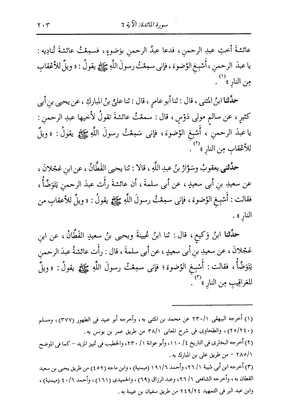 حَدَّثَنَا ابْنُ وَكِيعٍ قَالَ: ثنا ابْنُ عُيَيْنَةَ وَيَحْيَى بْنُ سَعِيدٍ الْقَطَّانُ , عَنِ ابْنِ عَجْلَانَ , عَنْ سَعِيدِ بْنِ أَبِي سَعِيدٍ , عَنْ أَبِي سَلَمَةَ , قَالَ: رَأَتْ عَائِشَةُ عَبْدَ الرَّحْمَنِ يَتَوَضَّأُ , فَقَالَتْ: أَسْبِغِ الْوُضُوءَ , فَإِنِّي سَمِعْتُ رَسُولَ اللَّهِ صَلَّى اللهُ عَلَيْهِ وَسَلَّمَ يَقُولُ: «§وَيْلٌ لِلْعَرَاقِيبِ مِنَ النَّارِ»