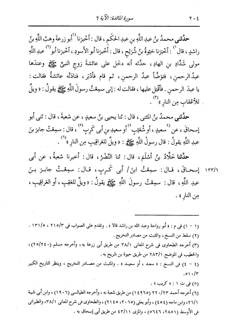 حَدَّثَنِي مُحَمَّدُ بْنُ عَبْدِ اللَّهِ بْنِ عَبْدِ الْحَكَمِ , قَالَ: أَخْبَرَنَا أَبُو رَوَاحَةَ وَعَبْدُ اللَّهِ بْنُ رَاشِدٍ , قَالَا: أَخْبَرَنَا حَيْوَةُ بْنُ شُرَيْحٍ , قَالَ: أَخْبَرَنَا أَبُو الْأَسْوَدِ , أَخْبَرَنَا أَبُو عَبْدِ اللَّهِ مَوْلَى شَدَّادِ بْنِ الْهَادِ , حَدَّثَهُ أَنَّهُ دَخَلَ عَلَى عَائِشَةَ زَوْجِ النَّبِيِّ صَلَّى اللهُ عَلَيْهِ وَسَلَّمَ وَعِنْدَهَا عَبْدُ الرَّحْمَنِ , فَتَوَضَّأَ عَبْدُ الرَّحْمَنِ , ثُمَّ قَامَ فَأَدْبَرَ , فَنَادَتْهُ عَائِشَةُ فَقَالَتْ: يَا عَبْدَ الرَّحْمَنِ. فَأَقْبَلَ عَلَيْهَا , فَقَالَتْ لَهُ: إِنِّي سَمِعْتُ رَسُولَ اللَّهِ صَلَّى اللهُ عَلَيْهِ وَسَلَّمَ يَقُولُ: «§وَيْلٌ لِلْأَعْقَابِ مِنَ النَّارِ»