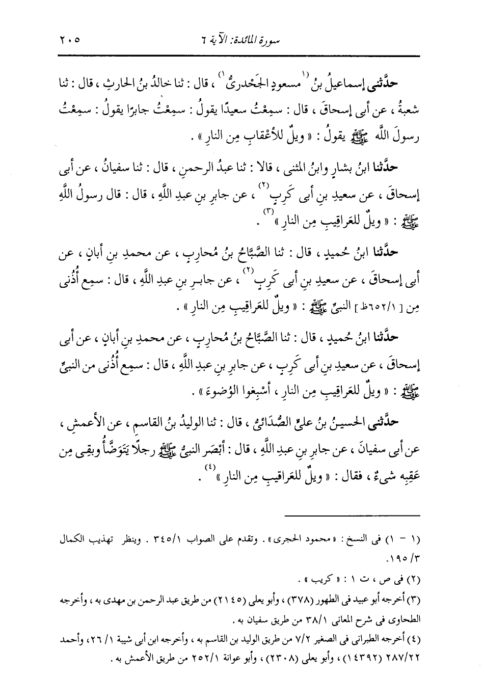 حَدَّثَنِي إِسْمَاعِيلُ بْنُ مَحْمُودٍ الْحَجِيرِيُّ , قَالَ: ثنا خَالِدُ بْنُ الْحَارِثِ , قَالَ: ثنا شُعْبَةُ , عَنْ أَبِي إِسْحَاقَ , قَالَ: سَمِعْتُ سَعِيدًا يَقُولُ: سَمِعْتُ جَابِرًا يَقُولُ: سَمِعْتُ رَسُولَ اللَّهِ صَلَّى اللهُ عَلَيْهِ وَسَلَّمَ يَقُولُ: «§وَيْلٌ لِلْأَعْقَابِ مِنَ النَّارِ»