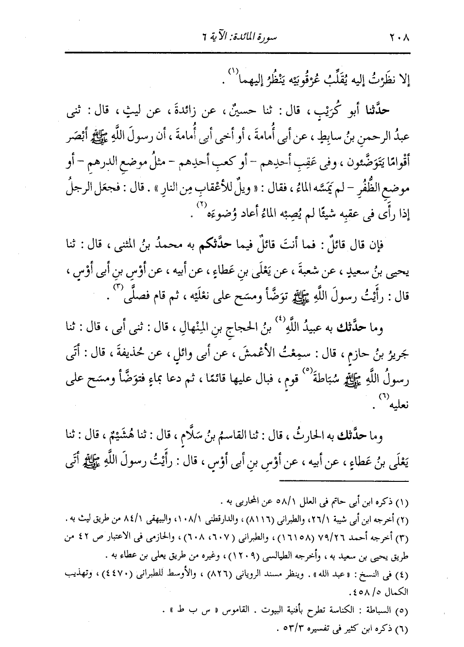 حَدَّثَنَا أَبُو كُرَيْبٍ , قَالَ: ثنا حُسَيْنٌ , عَنْ زَائِدَةَ , عَنْ لَيْثٍ , قَالَ: ثني عَبْدُ الرَّحْمَنِ بْنُ سَابِطٍ , عَنْ أَبِي أُمَامَةَ , أَو أَخِي أَبِي أُمَامَةَ: أَنَّ رَسُولَ اللَّهِ صَلَّى اللهُ عَلَيْهِ وَسَلَّمَ أَبْصَرَ أَقْوَامًا يَتَوَضَّئُونَ , وَفِي عَقِبِ أَحَدِهِمْ أَوْ كَعْبِ أَحَدِهِمْ مِثْلُ مَوْضِعِ الدِّرْهَمِ أَوْ مَوْضِعِ الظُّفُرِ , لَمْ يَمَسَّهُ الْمَاءُ , فَقَالَ: «§وَيْلٌ لِلْأَعْقَابِ مِنَ النَّارِ» قَالَ: فَجَعَلَ الرَّجُلُ إِذَا رَأَى فِي عَقِبِهِ شَيْئًا لَمْ يُصِبْهُ الْمَاءُ أَعَادَ وُضُوءَهُ "