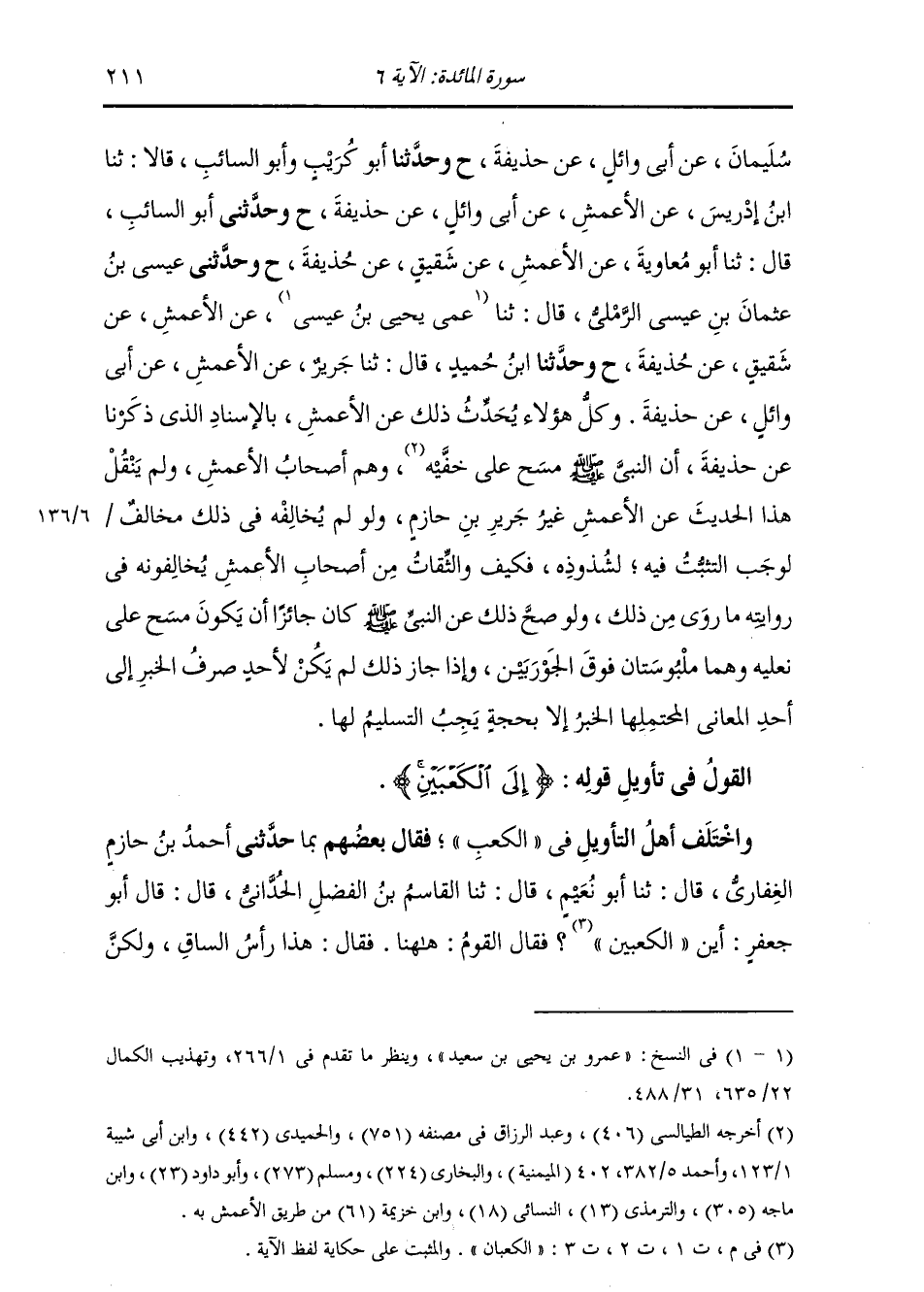 §الْقَوْلُ فِي تَأْوِيلِ قَوْلِهِ تَعَالَى: {إِلَى الْكَعْبَيْنِ} [المائدة: 6] وَاخْتَلَفَ أَهْلُ التَّأْوِيلِ فِي الْكَعْبِ , فَقَالَ بَعْضُهُمْ بِمَا: