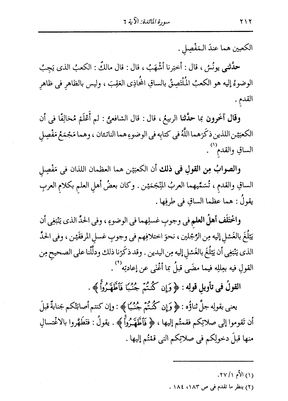 حَدَّثَنَا الرَّبِيعُ , قَالَ: قَالَ الشَّافِعِيُّ: لَمْ أَعْلَمْ مُخَالِفًا فِي أَنَّ §الْكَعْبَيْنِ اللَّذَيْنِ ذَكَرَهُمَا اللَّهُ فِي كِتَابِهِ فِي الْوُضُوءِ هُمَا النَّاتِئَانِ وَهُمَا مَجْمَعُ فِصَلِ السَّاقِ وَالْقَدَمِ وَالصَّوَابُ مِنَ الْقَوْلِ فِي ذَلِكَ أَنَّ الْكَعْبَيْنِ هُمَا الْعَظْمَانِ اللَّذَانِ فِي مَفْصِلِ السَّاقِ وَالْقَدَمِ تُسَمِّيهُمَا الْعَرَبُ الْمِنْجَمَيْنِ. وَكَانَ بَعْضُ أَهْلِ الْعِلْمِ بِكَلَامِ الْعَرَبِ يَقُولُ: هُمَا عَظْمَا السَّاقِ فِي طَرَفِهَا. وَاخْتَلَفَ أَهْلُ الْعِلْمِ فِي وُجُوبِ غَسْلِهِمَا فِي الْوُضُوءِ وَفِي الْحَدِّ الَّذِي يَنْبَغِي أَنْ يَبْلُغَ بِالْغُسْلِ إِلَيْهِ مِنَ الرِّجْلَيْنِ نَحْوَ اخْتِلَافِهِمْ فِي وُجُوبِ غُسْلِ الْمِرْفَقَيْنِ , وَفِي الْحَدِّ الَّذِي يَنْبَغِي أَنْ يَبْلُغَ بِالْغُسْلِ إِلَيْهِ مِنَ الْيَدَيْنِ. وَقَدْ ذَكَرْنَا ذَلِكَ وَدَلَّلْنَا عَلَى الصَّحِيحِ مِنَ الْقَوْلِ فِيهِ بِعِلَلِهِ فِيمَا مَضَى قَبْلُ بِمَا أَغْنَى عَنْ إِعَادَتِهِ