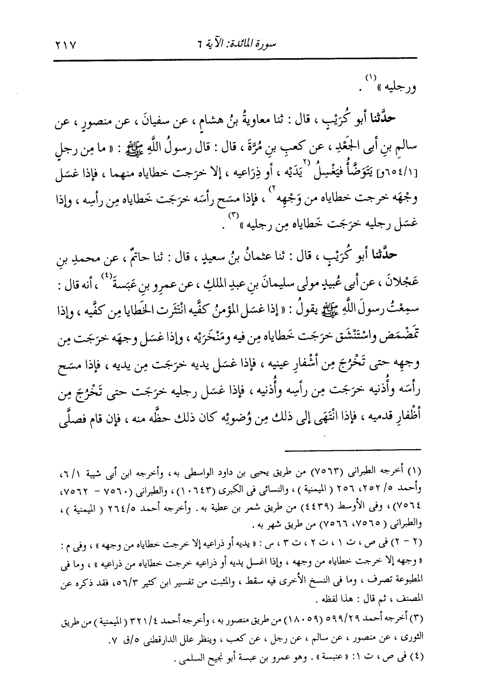 حَدَّثَنَا أَبُو كُرَيْبٍ , قَالَ: ثنا عُثْمَانُ بْنُ سَعِيدٍ , قَالَ: ثنا حَاتِمٌ , عَنْ مُحَمَّدِ بْنِ عَجْلَانَ , عَنْ أَبِي عُبَيْدٍ مَوْلَى سُلَيْمَانَ بْنِ عَبْدِ الْمَلِكِ , عَنْ عَمْرِو بْنِ عَبَسَةَ , أَنَّهُ قَالَ: سَمِعْتُ رَسُولَ اللَّهِ صَلَّى اللهُ عَلَيْهِ وَسَلَّمَ يَقُولُ: «§إِذَا غَسَلَ الْمُؤْمِنُ كَفَّيْهِ انْتَثَرَتِ الْخَطَايَا مِنْ كَفَّيْهِ , وَإِذَا تَمَضْمَضَ وَاسْتَنْشَقَ خَرَجَتْ خَطَايَاهُ مِنْ فِيهِ وَمِنْخَرَيْهِ , وَإِذَا غَسَلَ وَجْهَهُ خَرَجَتْ مِنْ وَجْهِهِ حَتَّى تَخْرُجَ مِنْ أَشْفَارِ عَيْنَيْهِ , فَإِذَا غَسَلَ يَدَيْهِ خَرَجَتْ مِنْ يَدَيْهِ , فَإِذَا مَسَحَ رَأْسَهُ وَأُذُنَيْهِ خَرَجَتْ مِنْ رَأْسِهِ وَأُذُنَيْهِ , فَإِذَا غَسَلَ رِجْلَيْهِ خَرَجَتْ حَتَّى تَخْرُجَ مِنْ أَظْفَارِ قَدَمَيْهِ , فَإِذَا انْتَهَى إِلَى ذَلِكَ مِنْ وُضُوئِهِ كَانَ ذَلِكَ حَظَّهُ مِنْهُ , فَإِنْ قَامَ فَصَلَّى -[218]- رَكْعَتَيْنِ مُقْبِلًا فِيهِمَا بِوَجْهِهِ وَقَلْبِهِ عَلَى رَبِّهِ كَانَ مِنْ خَطَايَاهُ كَيَوْمِ وَلَدَتْهُ أُمُّهُ»
