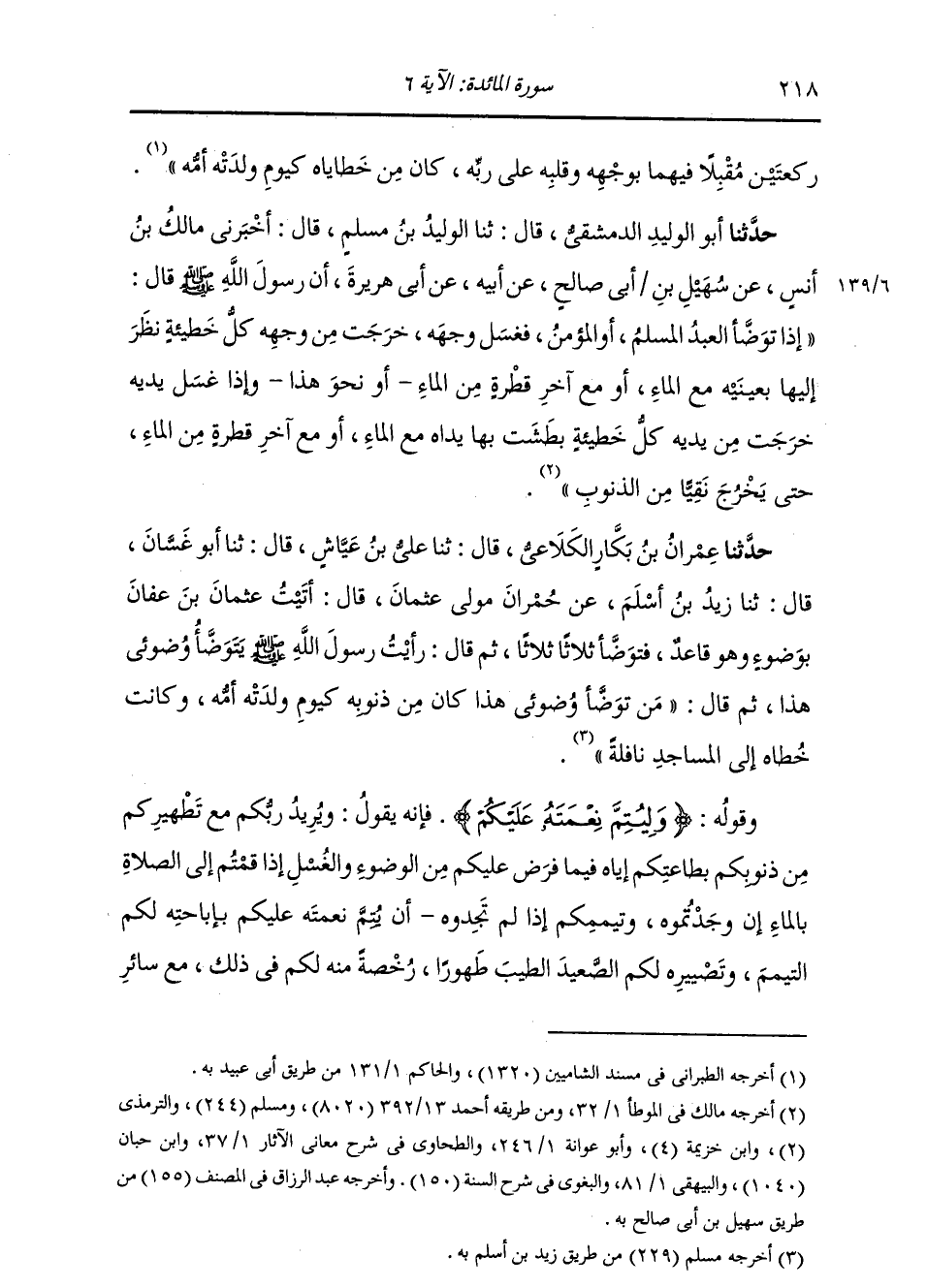 حَدَّثَنَا عِمْرَانُ بْنُ بَكَّارٍ الْكَلَاعِيُّ , قَالَ: ثنا عَلِيُّ بْنُ عَيَّاشٍ , قَالَ: ثنا أَبُو غَسَّانَ , قَالَ: ثنا زَيْدُ بْنُ أَسْلَمَ , عَنْ حُمْرَانَ , مَوْلَى عُثْمَانَ , قَالَ: أَتَيْتُ عُثْمَانَ بْنَ عَفَّانَ بِوَضُوءٍ وَهُوَ قَاعِدٌ , فَتَوَضَّأَ ثَلَاثًا ثَلَاثًا , ثُمَّ قَالَ: رَأَيْتُ رَسُولَ اللَّهِ صَلَّى اللهُ عَلَيْهِ وَسَلَّمَ يَتَوَضَّأُ كَوُضُوئِي هَذَا , ثُمَّ قَالَ: «§مَنْ تَوَضَّأَ وُضُوئِي هَذَا كَانَ مِنْ ذُنُوبِهِ كَيَوْمَ وَلَدَتْهُ أُمُّهُ , وَكَانَتْ خُطَاهُ إِلَى الْمَسَاجِدِ نَافِلَةً» وَقَوْلُهُ: {وَلِيُتِمَّ نِعْمَتَهُ عَلَيْكُمْ} [المائدة: 6] فَإِنَّهُ يَقُولُ: وَيُرِيدُ رَبُّكُمْ مَعَ تَطْهِيرِكُمْ مِنْ ذُنُوبِكُمْ بِطَاعَتِكُمْ إِيَّاهُ فِيمَا فَرَضَ عَلَيْكُمْ مِنَ الْوُضُوءِ وَالْغُسْلِ إِذَا قُمْتُمْ إِلَى الصَّلَاةِ بِالْمَاءِ إِنْ وَجَدْتُمُوهُ , وَتَيَمُّمِكُمْ إِذَا لَمْ تَجِدُوهُ , أَنْ يُتِمَّ نِعْمَتَهُ عَلَيْكُمْ بِإِبَاحَتِهِ لَكُمُ التَّيَمُّمَ , وَتَصْيِيرِهِ لَكُمُ الصَّعِيدَ الطَّيِّبَ طَهُورًا , رُخْصَةً مِنْهُ لَكُمْ فِي ذَلِكَ مَعَ سَائِرِ -[219]- نِعَمِهِ الَّتِي أَنْعَمَ بِهَا عَلَيْكُمْ أَيُّهَا الْمُؤْمِنُونَ. {لَعَلَّكُمْ تَشْكُرُونَ} [المائدة: 6] يَقُولُ: " تَشْكُرُونَ اللَّهَ عَلَى نِعَمِهِ الَّتِي أَنْعَمَهَا عَلَيْكُمْ بِطَاعَتِكُمْ إِيَّاهُ فِيمَا أَمَرَكُمْ وَنَهَاكُمْ