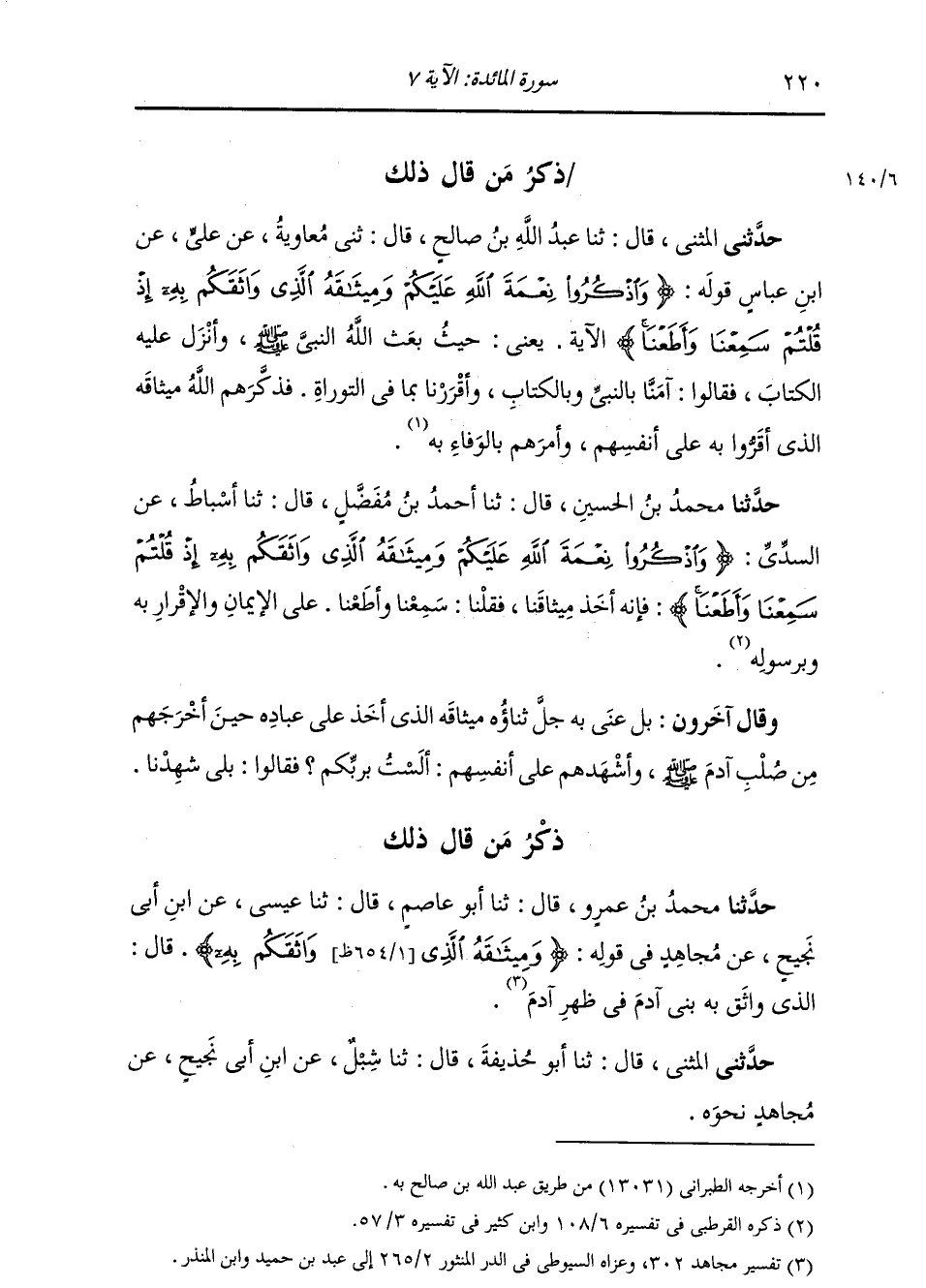 ذِكْرُ مَنْ قَالَ ذَلِكَ: حَدَّثَنِي الْمُثَنَّى , قَالَ: ثنا عَبْدُ اللَّهِ بْنُ صَالِحٍ , قَالَ: ثني مُعَاوِيَةُ , عَنْ عَلِيٍّ , عَنِ ابْنِ عَبَّاسٍ , قَوْلُهُ: {§وَاذْكُرُوا نِعْمَةَ اللَّهِ عَلَيْكُمْ وَمِيثَاقَهُ الَّذِي وَاثَقَكُمْ بِهِ إِذْ قُلْتُمْ سَمِعْنَا وَأَطَعْنَا} [المائدة: 7] الْآيَةُ , يَعْنِي: حَيْثُ بَعَثَ اللَّهُ النَّبِيَّ صَلَّى اللهُ عَلَيْهِ وَسَلَّمَ , وَأَنْزَلَ عَلَيْهِ الْكِتَابَ , فَقَالُوا: آمَنَّا بِالنَّبِيِّ وَبِالْكِتَابِ , وَأَقْرَرْنَا بِمَا فِي التَّوْرَاةِ. فذَكَّرَهُمُ اللَّهُ مِيثَاقَهُ الَّذِي أَقَرُّوا بِهِ عَلَى أَنْفُسِهِمْ , وَأَمَرَهُمْ بِالْوَفَاءِ بِهِ "