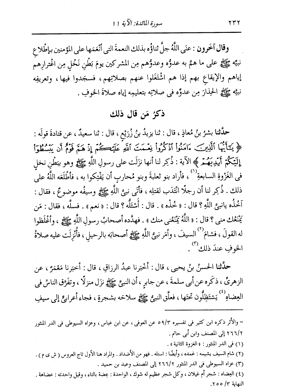 ذِكْرُ مَنْ قَالَ ذَلِكَ: حَدَّثَنَا بِشْرُ بْنُ مُعَاذٍ , قَالَ: ثنا يَزِيدُ بْنُ زُرَيْعٍ , قَالَ: ثنا سَعِيدٌ , عَنْ قَتَادَةَ , قَوْلُهُ: {§يَا أَيُّهَا الَّذِينَ آمَنُوا اذْكُرُوا نِعْمَةَ اللَّهِ عَلَيْكُمْ إِذْ هَمَّ قَوْمٌ أَنْ يَبْسُطُوا إِلَيْكُمْ أَيْدِيَهُمْ} الْآيَةُ , ذُكِرَ لَنَا أَنَّهَا نَزَلَتْ عَلَى رَسُولِ اللَّهِ صَلَّى اللهُ عَلَيْهِ وَسَلَّمَ وَهُوَ بِبَطْنِ نَخْلٍ فِي الْغَزْوَةِ السَّابِعَةِ , فَأَرَادَ بَنُو ثَعْلَبَةَ وَبَنُو مُحَارِبٍ أَنْ يَفْتِكُوا بِهِ , فَأَطْلَعَهُ اللَّهُ عَلَى ذَلِكَ " ذُكِرَ لَنَا أَنَّ رَجُلًا انْتَدَبَ لِقَتْلِهِ , فَأَتَى نَبِيَّ اللَّهِ صَلَّى اللهُ عَلَيْهِ وَسَلَّمَ وَسَيْفُهُ مَوْضُوعٌ , فَقَالَ: آخُذُهُ يَا نَبِيَّ اللَّهِ؟ قَالَ: «خُذْهُ» قَالَ: أَسْتَلُّهُ؟ قَالَ: «نَعَمْ» فَسَلَّهُ , فَقَالَ: مَنْ يَمْنَعُكَ مِنِّي؟ قَالَ: «اللَّهُ يَمْنَعُنِي مِنْكَ» فَهَدَّدَهُ أَصْحَابُ رَسُولِ اللَّهِ صَلَّى اللهُ عَلَيْهِ وَسَلَّمَ , وَأَغْلَظُوا لَهُ الْقَوْلَ , فَشَامَ السَّيْفُ , وَأَمَرَ نَبِيُّ اللَّهِ صَلَّى اللهُ عَلَيْهِ وَسَلَّمَ أَصْحَابَهُ بِالرَّحِيلِ , فَأُنْزِلَتْ عَلَيْهِ صَلَاةُ الْخَوْفِ عِنْدَ ذَلِكَ "