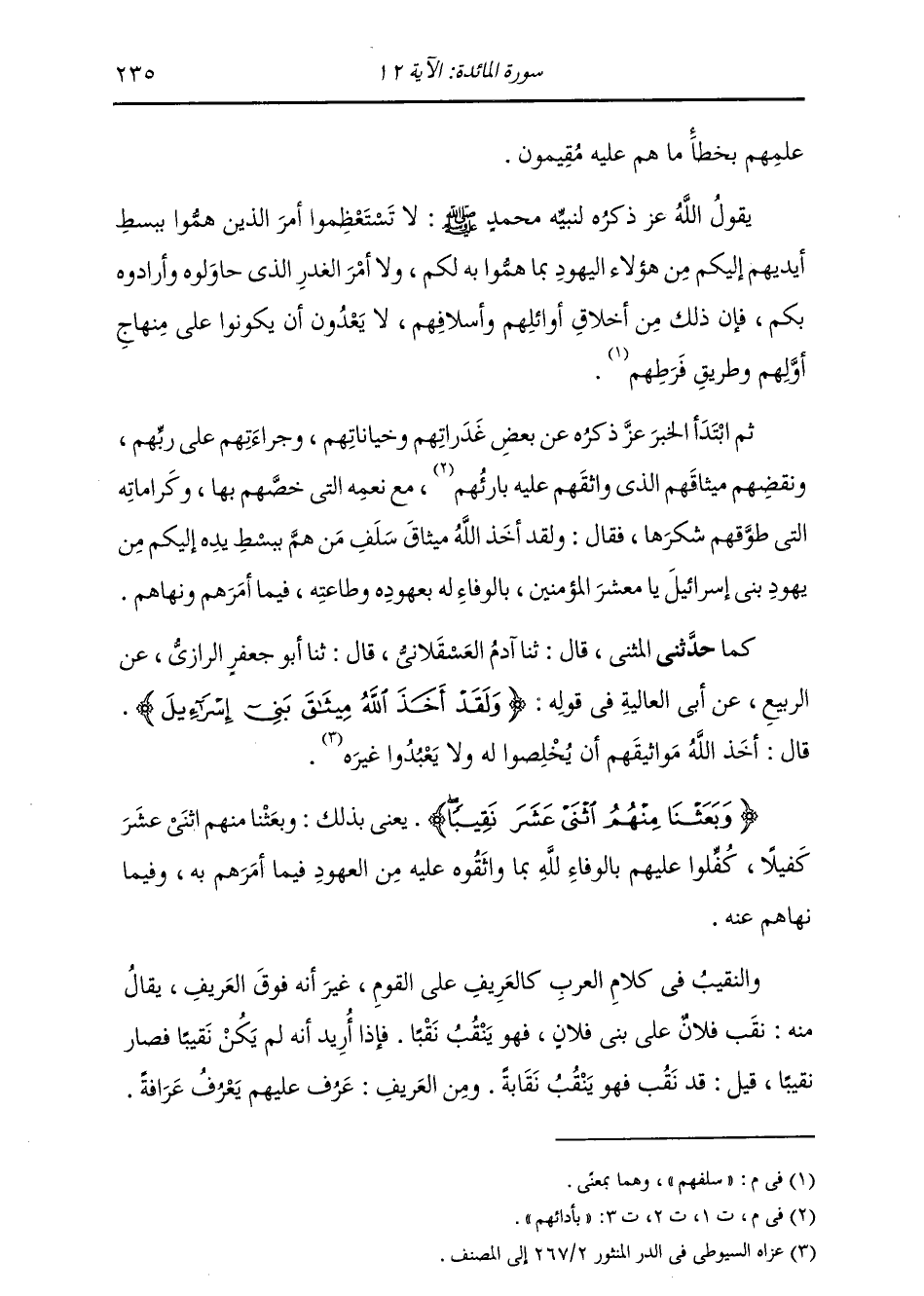 حَدَّثَنِي الْمُثَنَّى , قَالَ: ثنا آدَمُ الْعَسْقَلَانِيُّ , قَالَ: ثنا أَبُو جَعْفَرٍ الرَّازِيُّ , عَنِ الرَّبِيعِ , عَنْ أَبِي الْعَالِيَةِ , فِي قَوْلِهِ: {§وَلَقَدْ أَخَذَ اللَّهُ مِيثَاقَ بَنِي إِسْرَائِيلَ} [المائدة: 12] قَالَ: " أَخَذَ اللَّهُ مَوَاثِيقَهُمْ أَنْ يُخْلِصُوا لَهُ وَلَا يَعْبُدُوا غَيْرَهُ {وَبَعَثَنَا مِنْهُمُ} [المائدة: 12] يَعْنِي بِذَلِكَ: وَبَعَثَنَا مِنْهُمُ اثْنَيْ عَشَرَ كَفِيلًا , كَفَلُوا عَلَيْهِمْ بِالْوَفَاءِ لِلَّهِ بِمَا وَاثَقُوهُ عَلَيْهِ مِنَ الْعُهُودِ فِيمَا أَمَرَهُمْ بِهِ , وَفِيمَا نَهَاهُمْ عَنْهُ. وَالنَّقِيبُ فِي كَلَامِ الْعَرَبِ , كَالْعَرِيفِ عَلَى الْقَوْمِ , غَيْرَ أَنَّهُ فَوْقَ الْعَرِيفِ , يُقَالَ مِنْهُ: نَقَبَ فُلَانٌ عَلَى بَنِي فُلَانٍ فَهُوَ يَنْقُبُ نَقَبًا , فَإِذَا أُرِيدَ أَنَّهُ لَمْ يَكُنْ نَقِيبًا فَصَارَ نَقِيبًا , قِيلَ: قَدْ نَقَبَ فَهُوَ يَنْقَبُ نَقَابَةً , وَمِنَ الْعَرِيفِ: عَرَفَ عَلَيْهِمْ يَعْرِفُ عِرَافَةً. -[236]- فَأَمَّا الْمَنَاكِبُ فَإِنَّهُمْ كَالْأَعْوَانِ يَكُونُونَ مَعَ الْعُرَفَاءِ , وَاحِدُهُمْ مَنْكِبٌ. وَكَانَ بَعْضُ أَهْلِ الْعِلْمِ بِالْعَرَبِيَّةِ يَقُولُ: هُوَ الْأَمِينُ الضَّامِنُ عَلَى الْقَوْمِ. فَأَمَّا أَهْلُ التَّأْوِيلِ فَإِنَّهُمْ قَدِ اخْتَلَفُوا بَيْنَهُمْ فِي تَأْوِيلِهِ , فَقَالَ بَعْضُهُمْ: هُوَ الشَّاهِدُ عَلَى قَوْمِهِ "